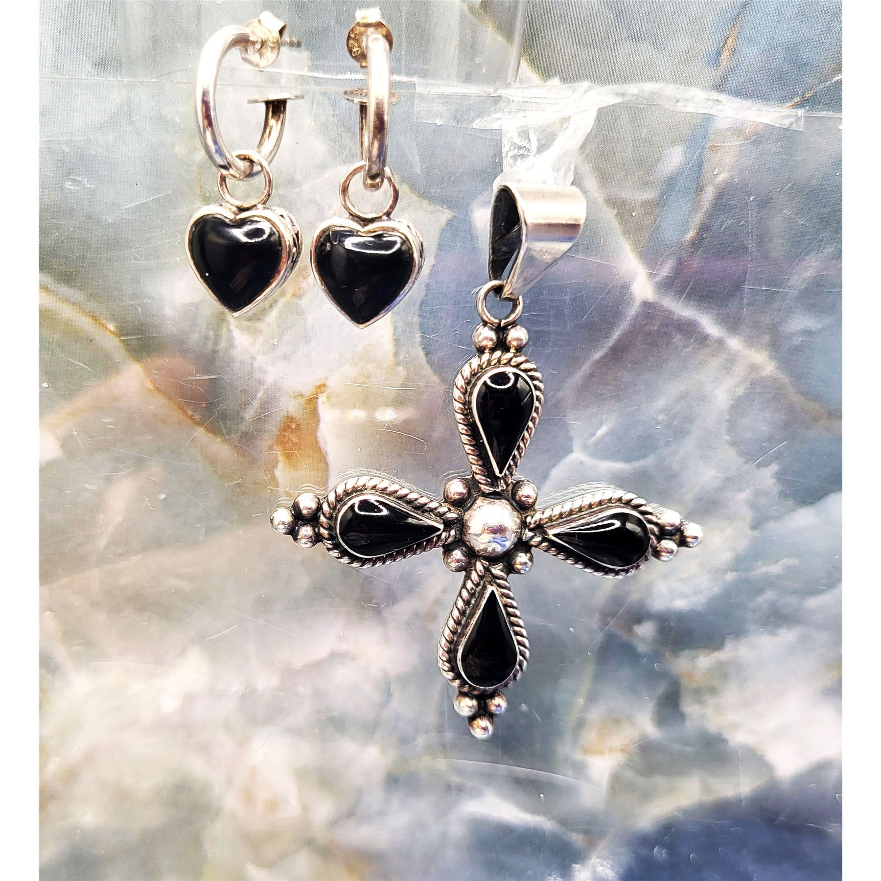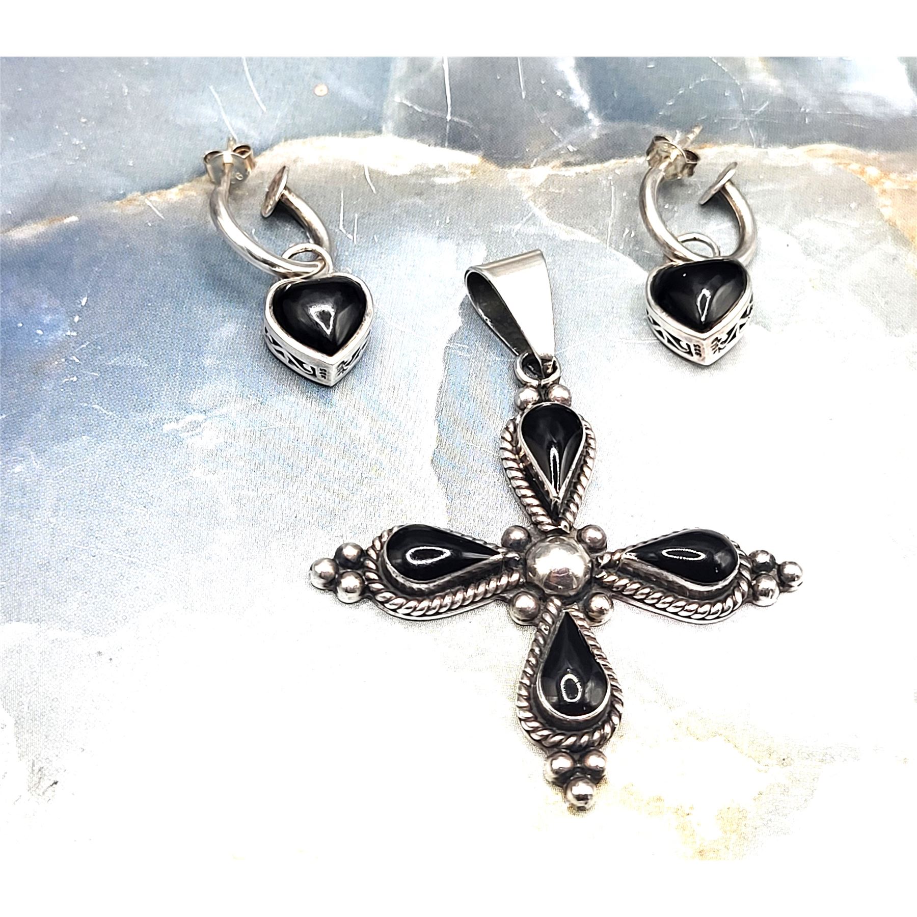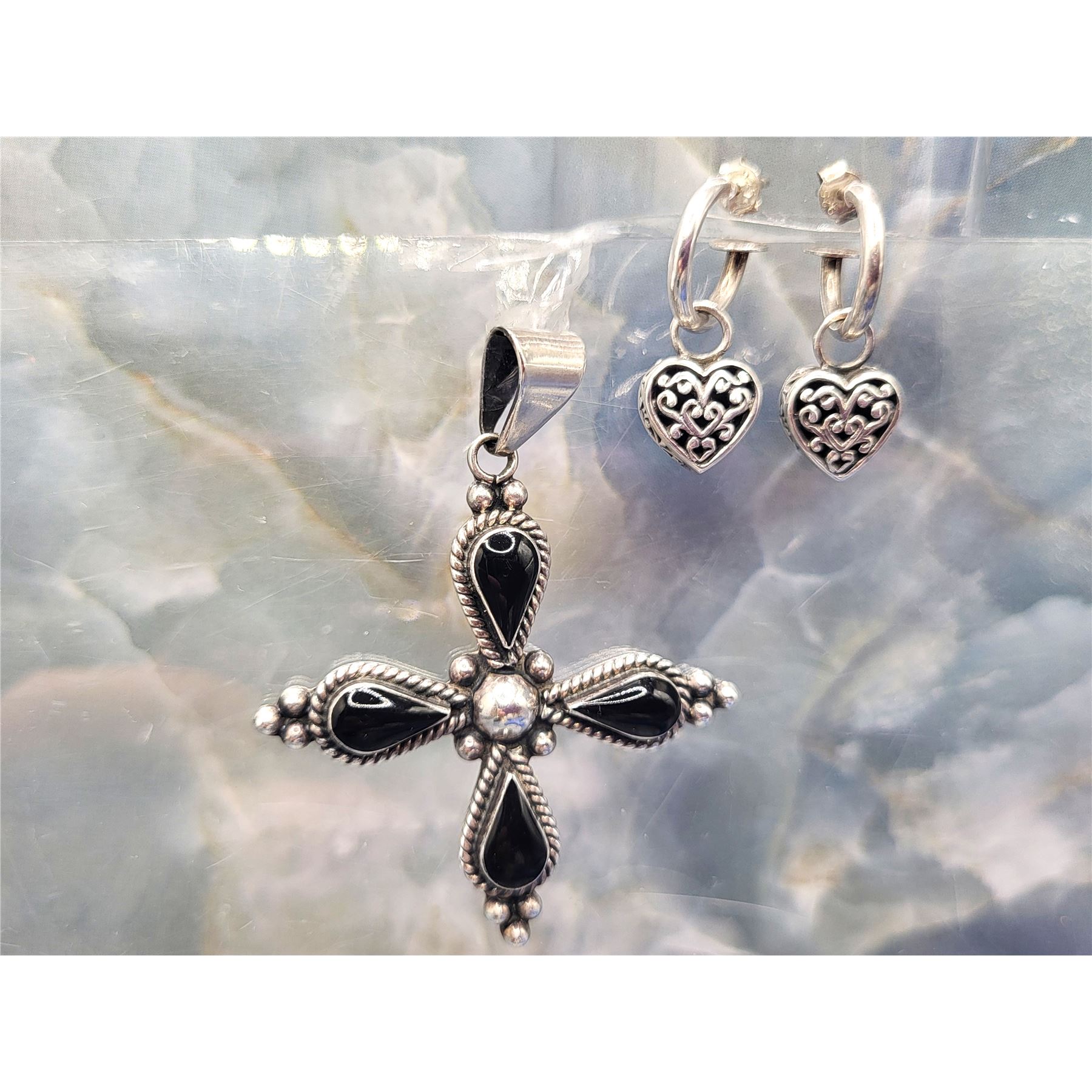 Signed HOB for House of Bangles, Mexico, sterling silver cross pendant features four polished, teardrop-shaped black onyx with sterling silver bead accents and a solid back gallery. A solid bail that is attached to a jump ring can accommodate up to an approximate 5.25mm chain. The bonus earrings are REVERSIBLE! They are sterling silver half hoops, marked SE Thaniland, with heart-shaped, polished black onyx in the front and beautiful scrollwork on the back with reticulated galleries in between. The earrings attach to the earlobes with posts and butterfly backs and have a flat stop plate to prevent the heart from sliding off. .Admin: K33/