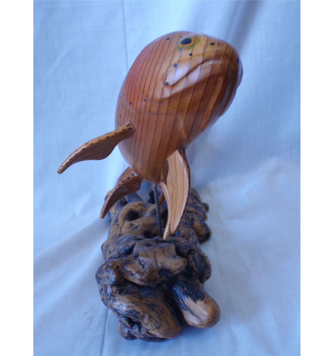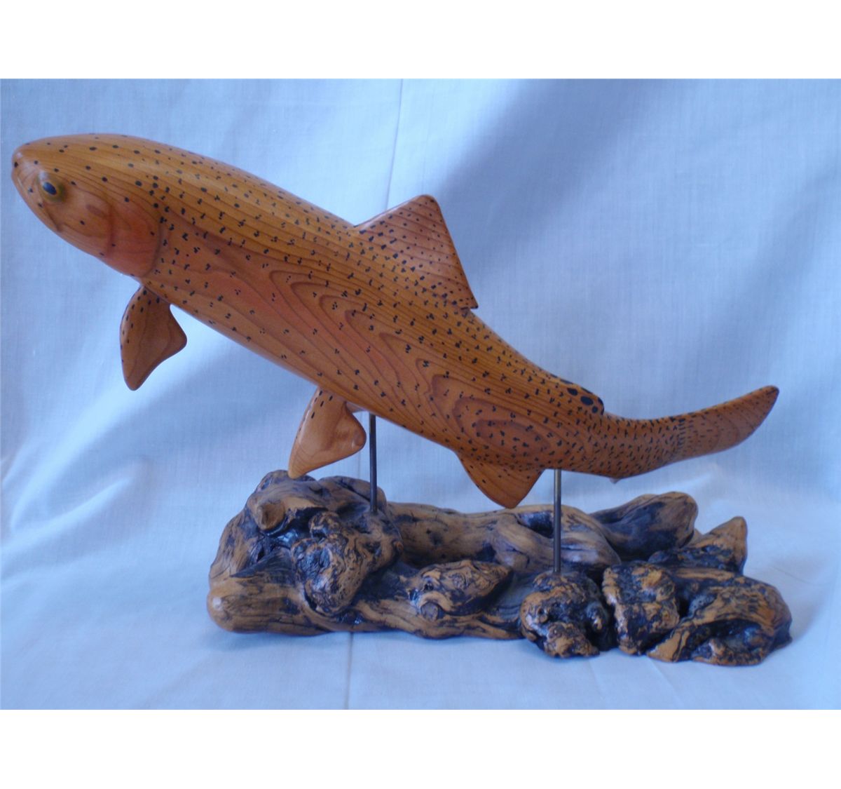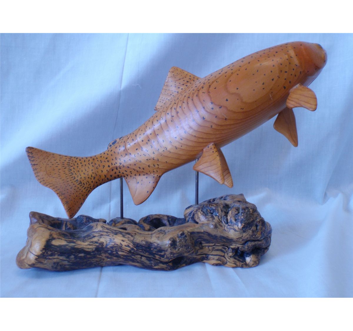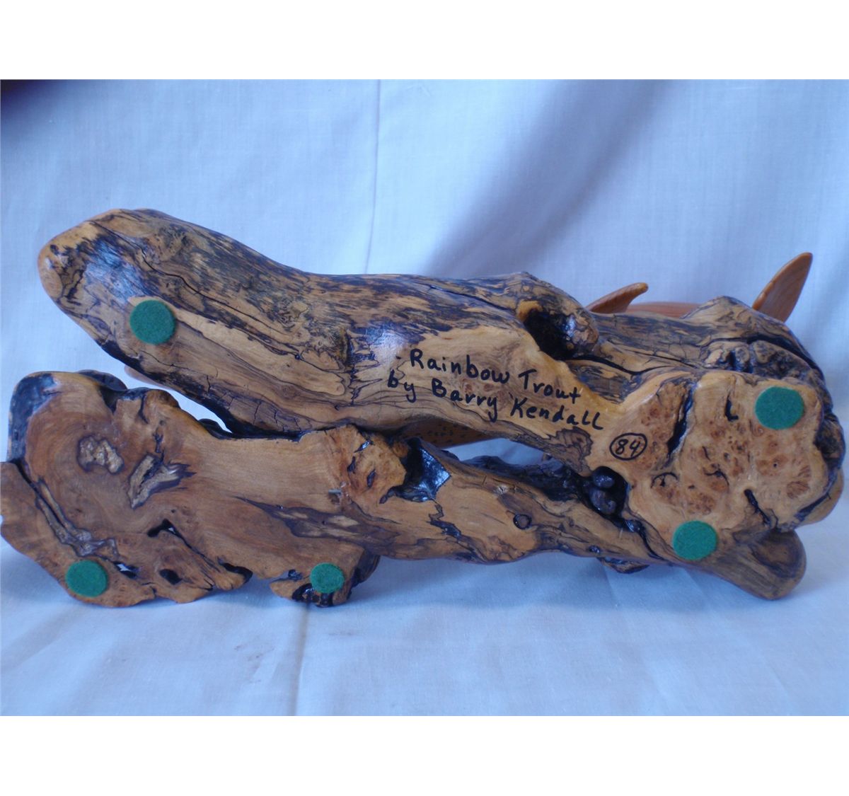 Masterfully hand carved by Barry Kendall in 1984. Base is burl. Fish is Spruce. The natural grain in the wood creates a unique scale-like effect. Measures: 15" x 10" Shipping on this lot: $20.00. Additional Shipping Charges for Lots sent outside of the U.S