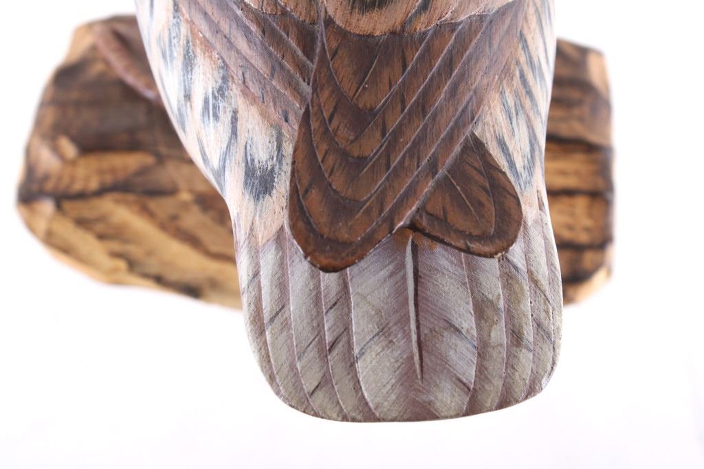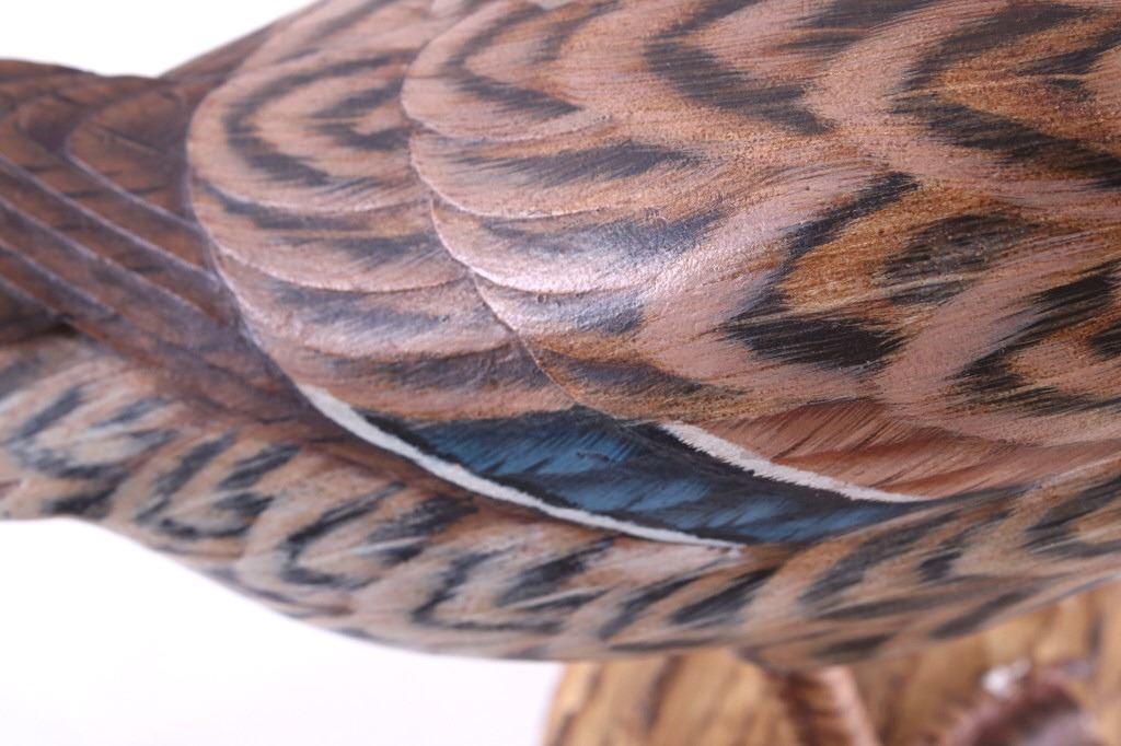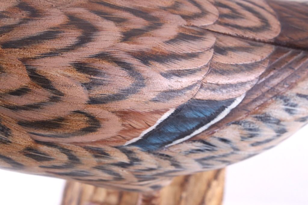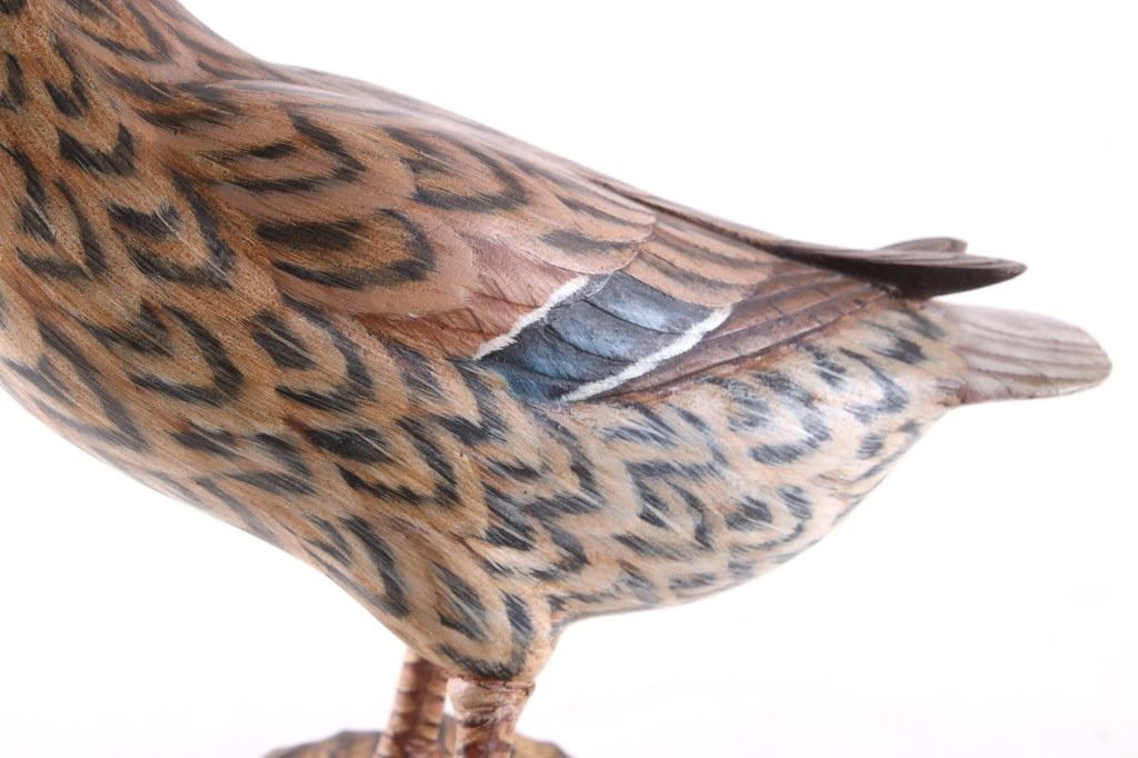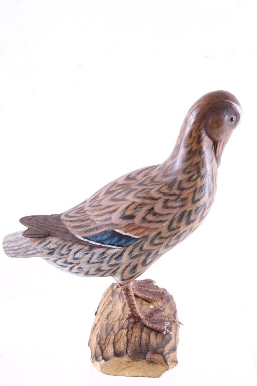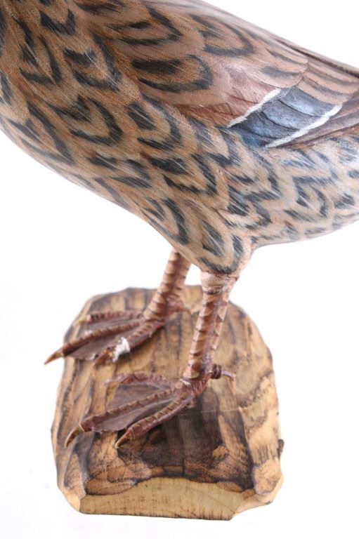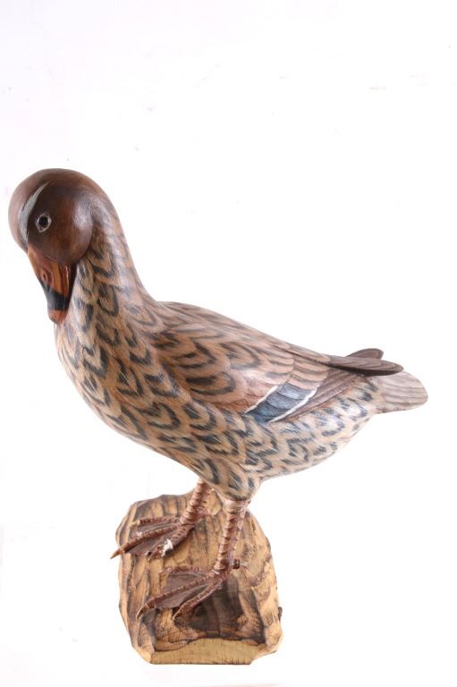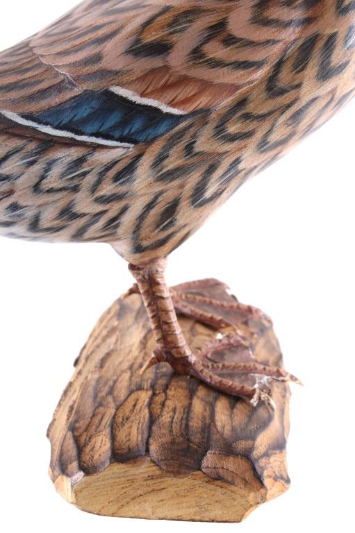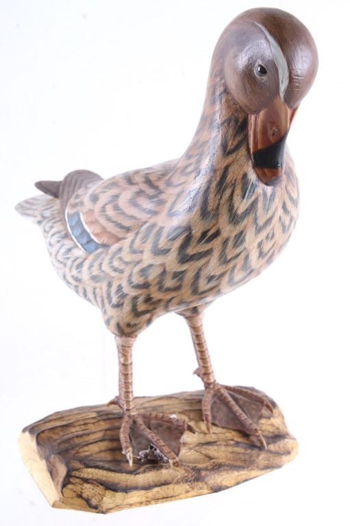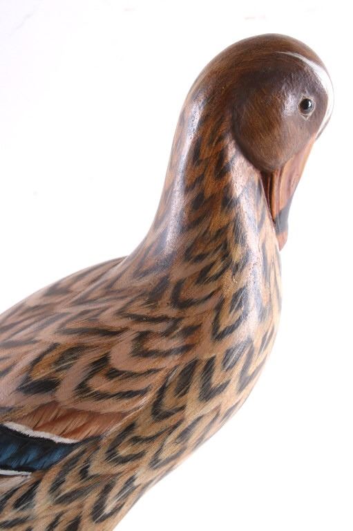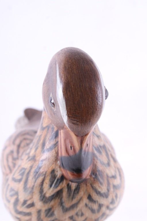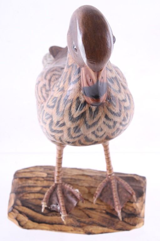 For your consideration is this signed hand painted Mallard hen mounted decoy. The Mallard is a dabbling duck that breeds throughout the temperate and subtropical Americas, Eurasia, and North Africa; and has been introduced to many other places around the world. This is a beautiful characterization of this waterfowl. This is a hand painted and mounted Mallard hen decoy poised upright and decorated in very close detail. There is a signature on the mounted piece of burnt wood on the bottom but is unreadable and in symbols. The hand painted decoy is in really pristine condition and shows immense attention to detail. The measurements of this mounted decoy are 11 1/2" x 6" x 11".