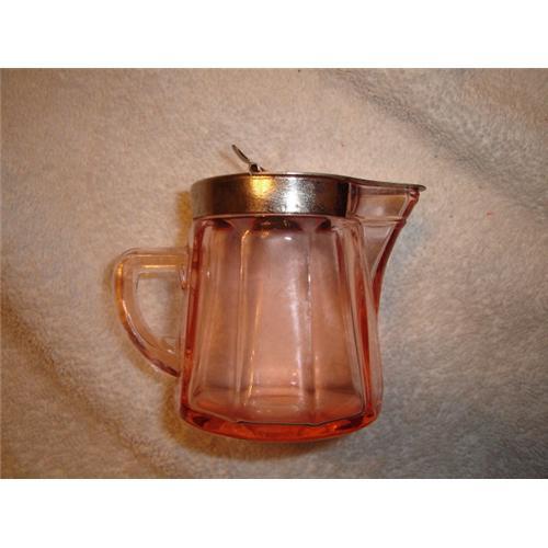 This is for the Signed Heisey Pink Panelled Miniature Syrup. It is 3" high,little over 4" from front to end of handle. It has 10 panels. The Heisey Diamond with H in it is by the spout. The chrome top shows use, but no oxidation. There are no chips, cracks, but there is very very minor roughness to inside edge of spout. The hinge works on chrome top.