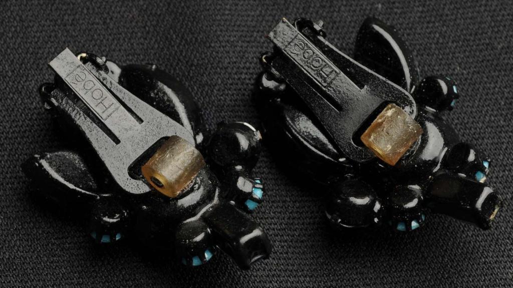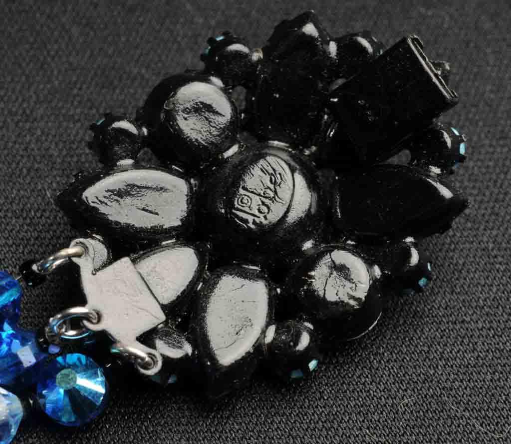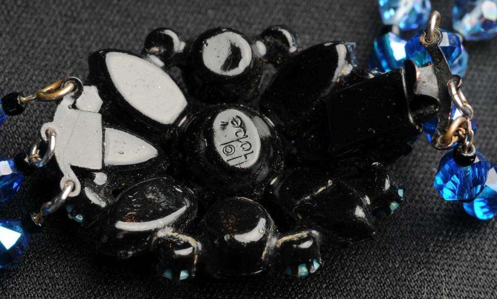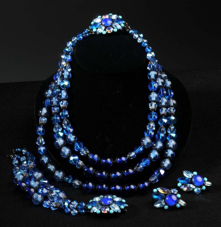Description Consists of three-strand glass beads necklace and bracelet with matching earrings in shades of blue. Rhinestone clasps with small nick in turquoise stone of earring. Condition (Very Good). Size Necklace: 17" L.