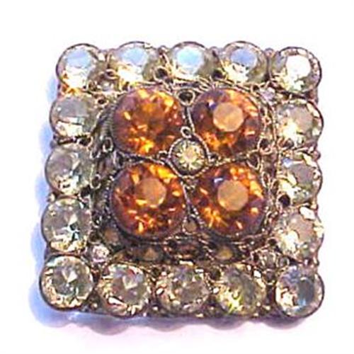 This is a brilliant unbacked rhinestone pin signed by Hobe. It measures 2" wide by 2" high and the pin back is set on the diagonal. The pin is made in layers of unfoiled crystal rhinestones set in gold filagree open work. The stones alternate by row in colors of amber and pale yellow. Each stone is like a headlight with it's bright aura. The pin is in perfect condition.