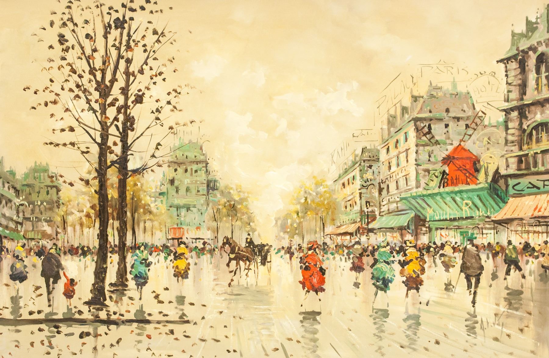 Oil on canvas. Featuring Paris city scene. Figures walking across the street with a horse-drawn carriage in the center. Signed illegibly to the bottom right. Stamp on verso reads "STUDIO DARTE ITALIA DEVITY". 60 x 89 cm (23.5 x 35 in), Frame: 79 x 108 cm (31 x 41 in)
