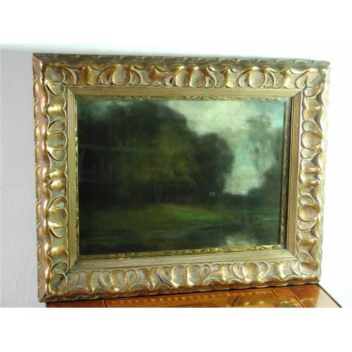 This is a rare, turn-of-the-century signed (I can't identify the artist) Impressionist pastel artwork, depicting a lush green landscape. this artwork is in the manner of Joseph Frank Currer (1843-1909) This artwork is in its original frame under glass, within an equally rare organically carved gilt-wood molding. This frame shows influence of the Art Nouveau period and is an important collector piece in itself.
