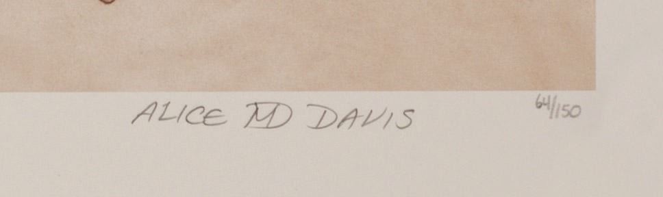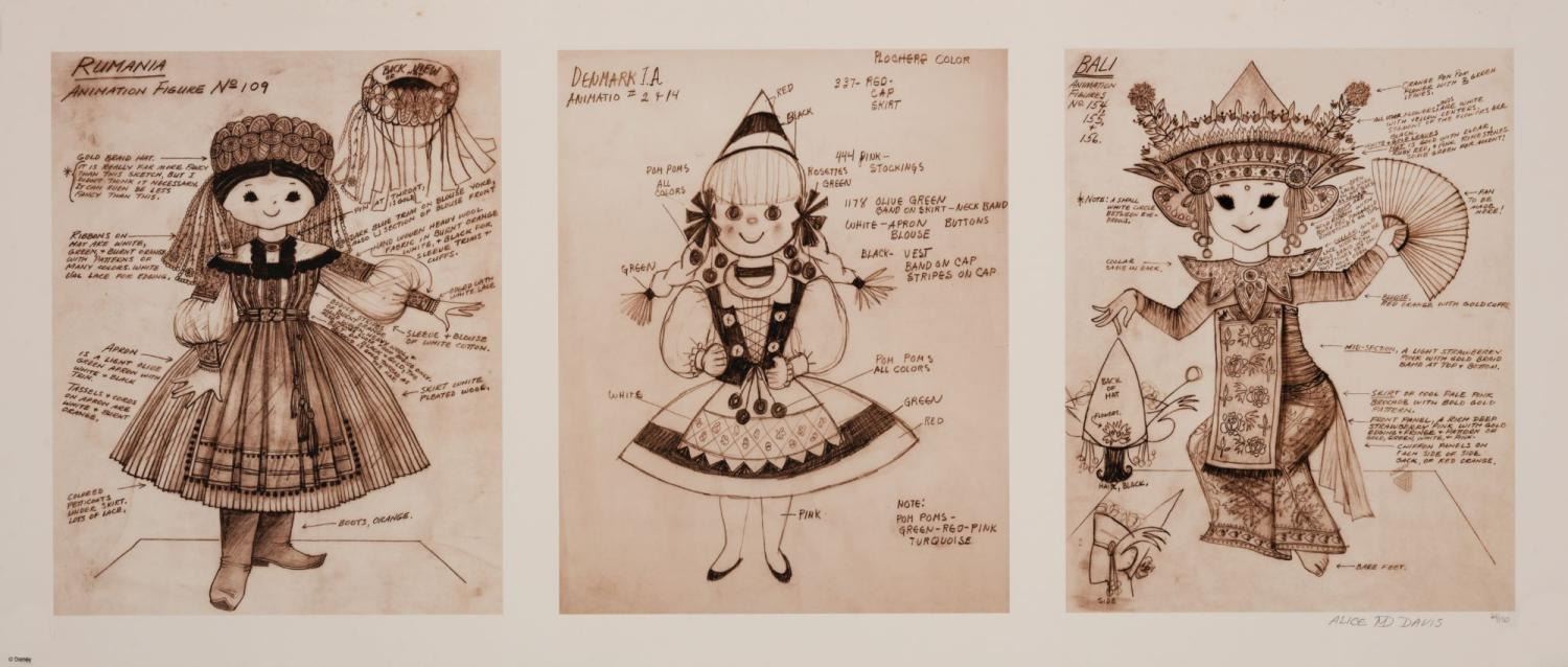 (Disney, 2001) A limited-edition print featuring Marc Davis' c.1963 production artwork of three dolls featured within the It's a Small World attraction at Disneyland. The print of the drawings feature dolls representing "Rumania [sic]", Denmark, and Bali. The limited-edition lithographic print is signed by Alice Davis and hand numbered 64/150. Measuring 28"x12", the print is in fine condition, with Disneyana COA included.