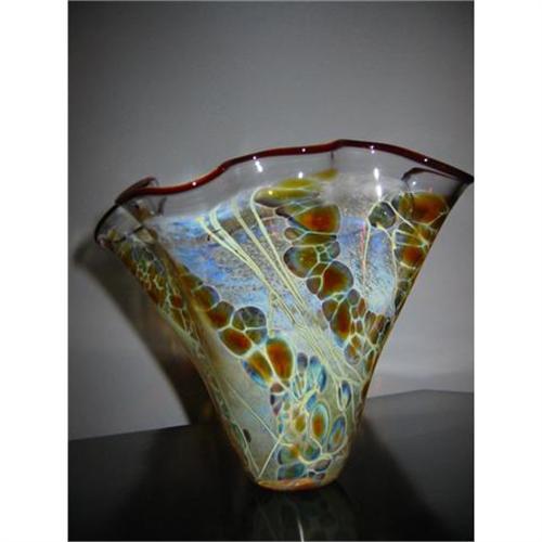 This Amazing hand crafted 7 inch by 9 inch Handkerchief vase is from Murano Italy. It has Artist's signature, venini murano on the glass close to the base. The colors are yellow, green, brown or gold trimmed with exquisite maroon. It has exciting shimmer and in excellent condition like new. base is 2 inch in diam. It is all hand painted and crafted in Italy.