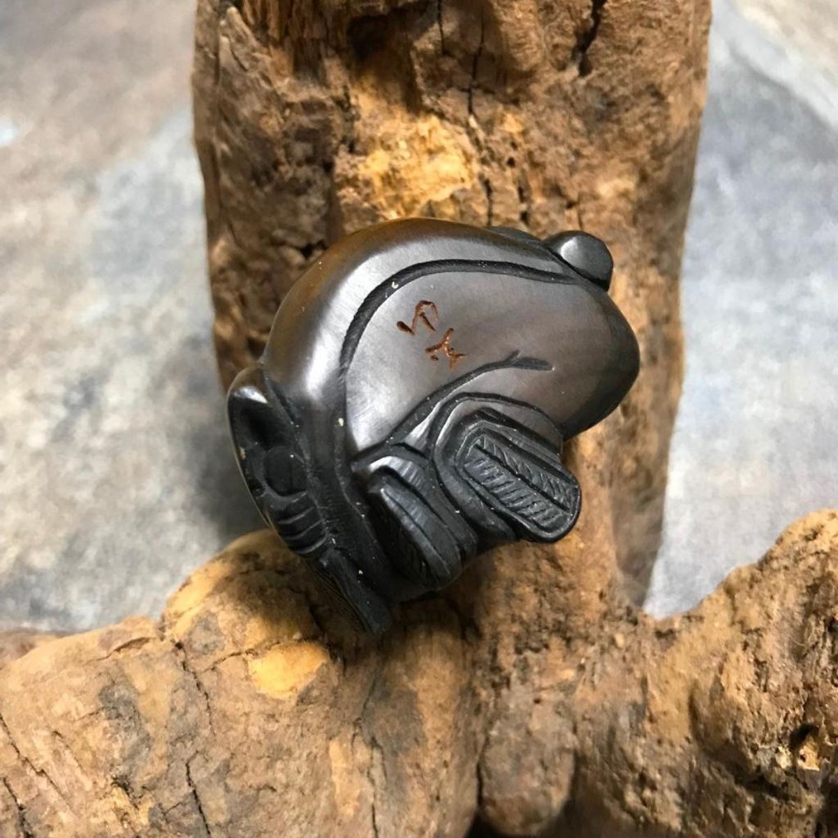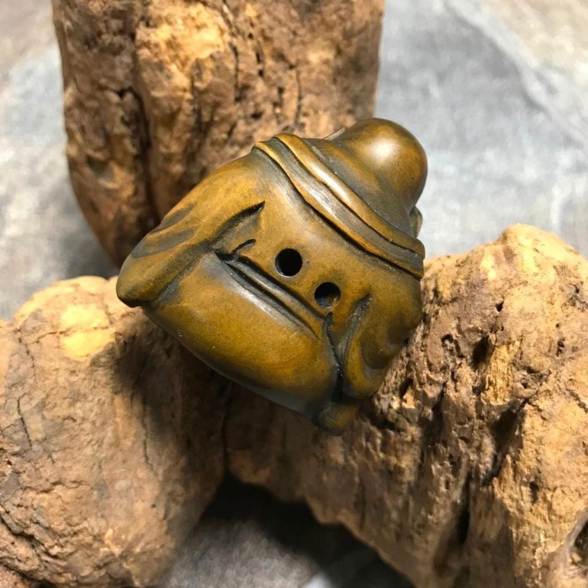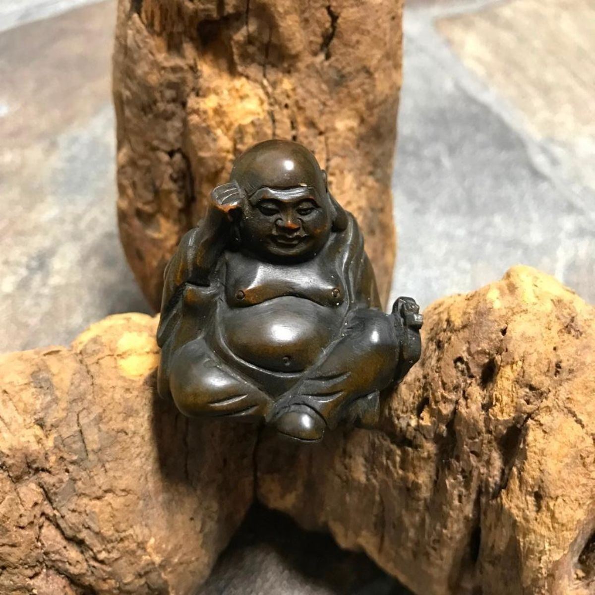 Hand carved Japanese boxwood netsuke, sculpture, in the form of a devout Buddha. Signed by the artist on the bottom. 1 3/4" H X 1 3/8" L X 1 1/2" W.