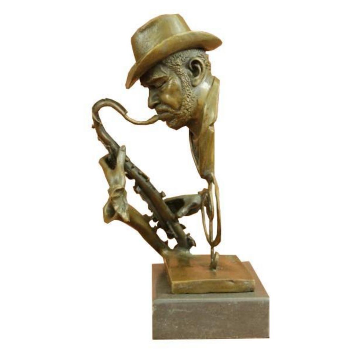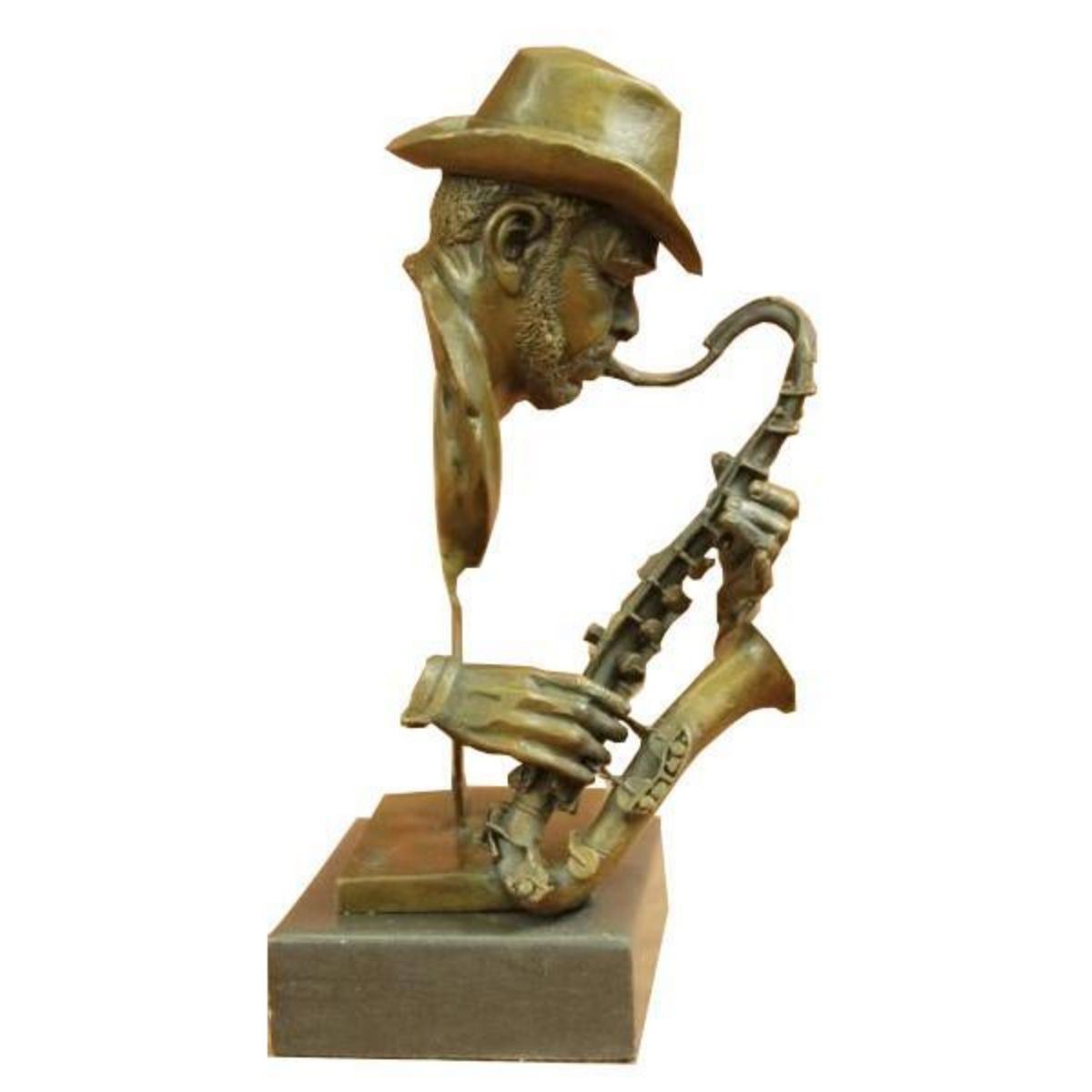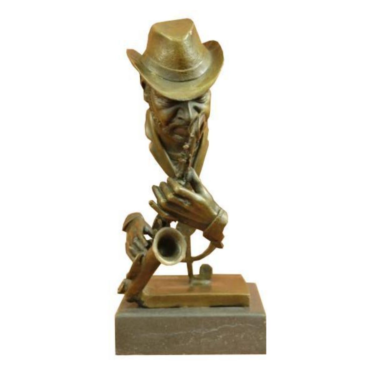 Original jazz saxophone player sculpture. Lost wax casting method bronze, with brown patina, mounted on marble base & signed by artist Dwight. 10" H X 5" W. 7 lbs.Â