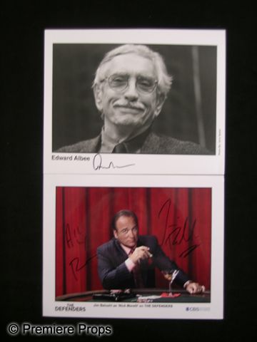 A pair of autographed photos of actor Jim Belushi and American playwright Edward Albee, known for such classics as 'The Sandbox' and 'Who's Afraid of Virginia Woolf?' The Jim Belushi photo is a glossy, color shot of him as 'Nick Morelli' from the CBS television drama The Defenders, and is signed in black ink. The Edward Albee photo is a glossy B&W shot and is also signed in black ink. (photos measure approx. 8" x 10" ea.)