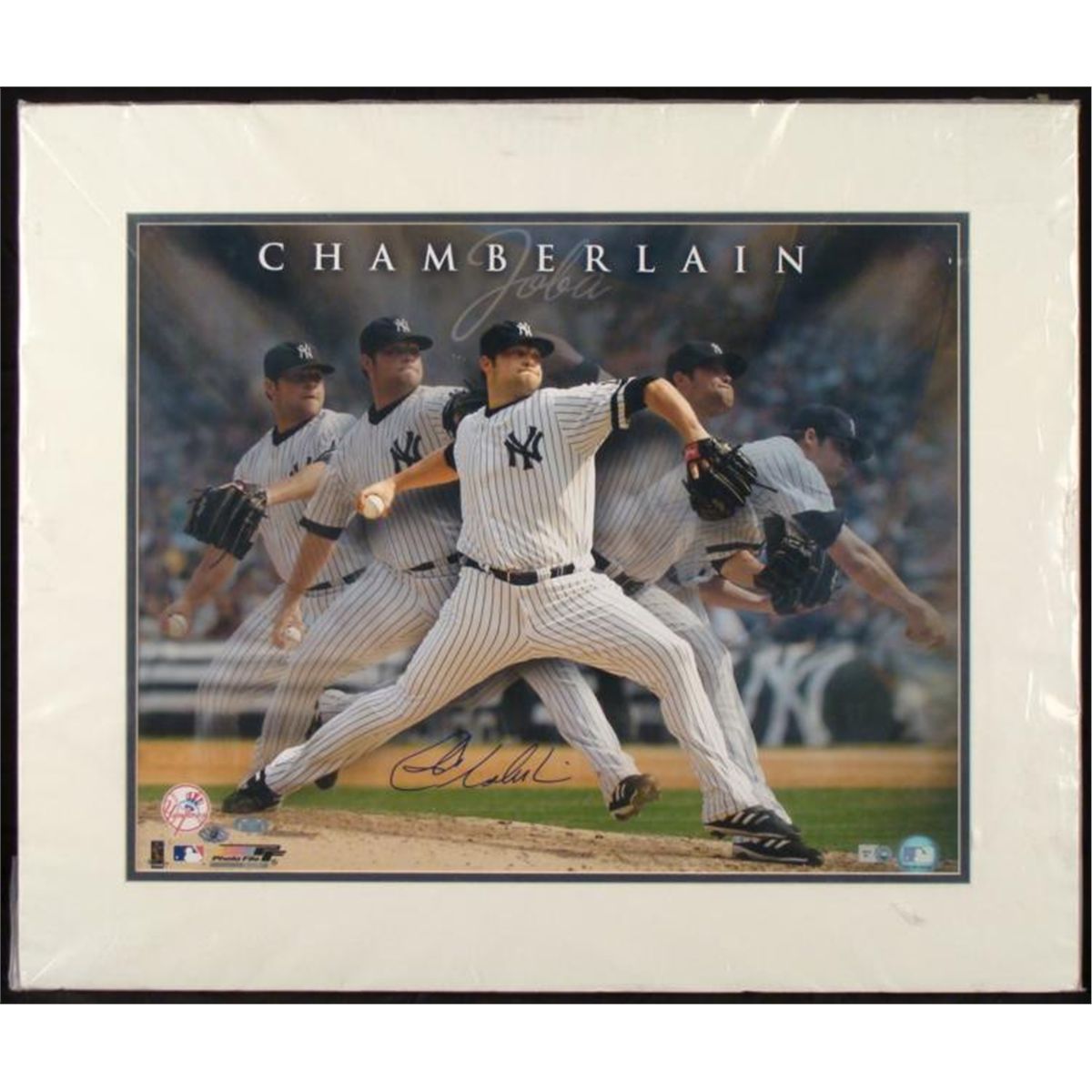 Here you get to see Joba Chamberlain's pitching mechanics. * * Medium: Print on paper * Signature: Joba Chamberlain, at the bottom in blue sharpie * Image size: 15 x 19 inchesSet-up: Double matted in white and navy blue, in plastic, ready to be framed Publisher: Photo FileHolograms: MLB and Steiner * Matte size: 20 1/2 x 24 1/2 inchesCondition: Excellent * The Certificate of Authenticity is from Choice Collectibles and is on the back of the photograph. *