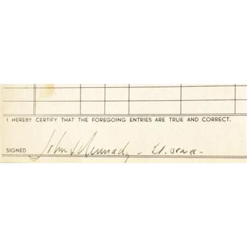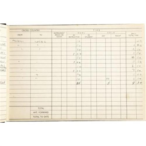 <B>Signed John F. Kennedy Student Pilot Log Book,</B></I> approximately 100 pp., 7.5” x 5.5”, Miami, Florida, May, 1944. Already a war hero on account of his adventures with PT-109 in the South Pacific, a recuperating John F. Kennedy was at the Submarine Chaser Training Center in Miami during the spring of 1944. While in Florida, Kennedy took flight lessons and kept this modest log. The book contains an early signature reading “<I>John F Kennedy - Lt. USNR</B></I> and identification information such as name, address and emergency contacts. These latter named are his parents, Mr. and Mrs. Joseph P. Kennedy. Ten manuscript entries for local training flights in a Piper Cub are entered between May 19 and May 29, 1944, the last being a solo flight. A signature line, <I>First solo OK Ed S 185018</B></I>” is no doubt an endorsement by Kennedy's instructor. Very light aging as expected, very fine condition. A unique relic by any standard.<BR><BR><b>Shipping:</b> Books & Catalogs (<a target="_blank" href="http://www.heritageauctions.com/common/shipping.php">view shipping information</a>)