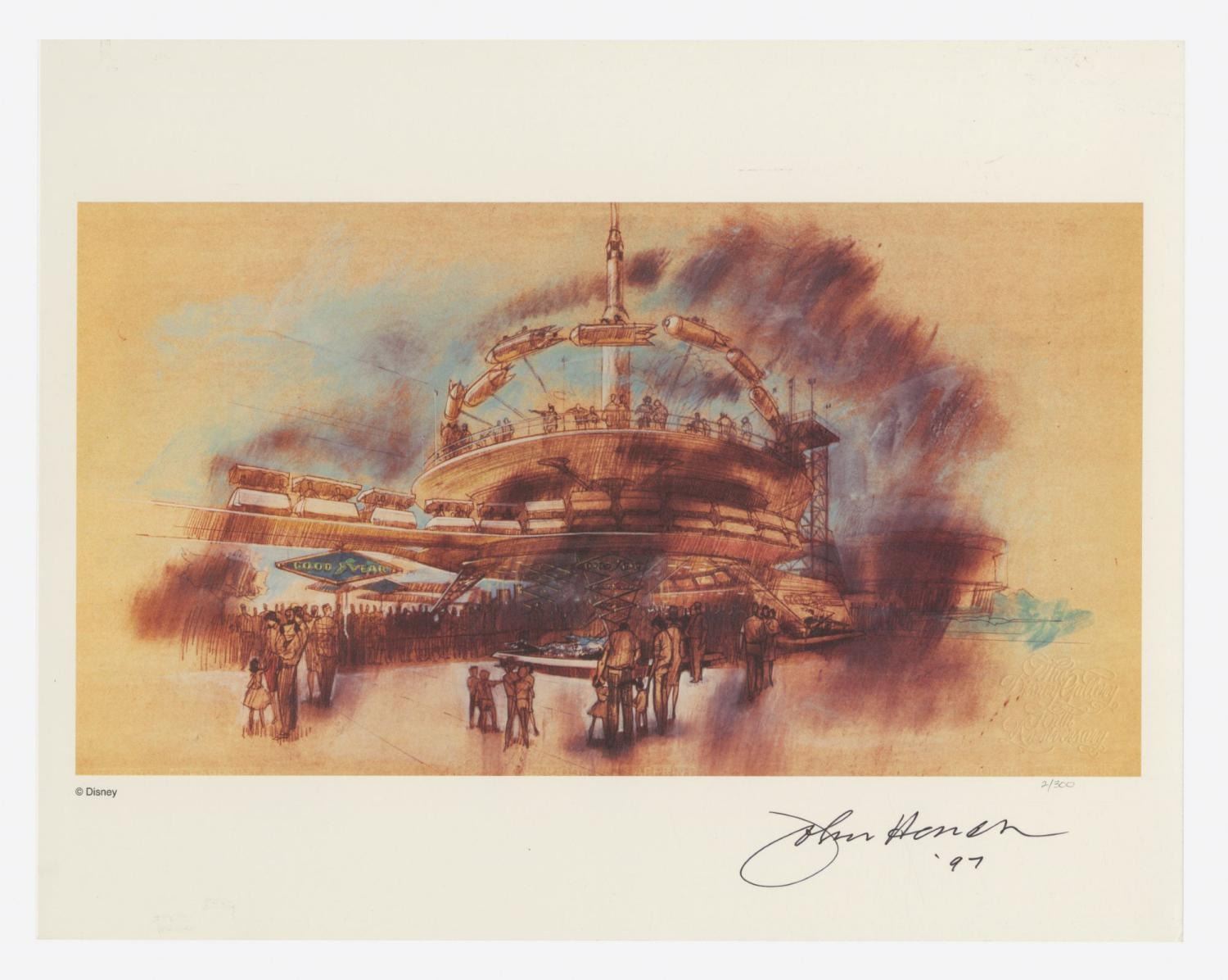 (Disneyland, 1997) A signed concept art lithograph featuring Imagineer John Hench's design for Tomorrowland. Proudly depicting the PeopleMover and Rocket Jets, the lithograph features Hench's rendering from 1965 and was offered through the Disney Gallery. It is signed by Hench in ink at the lower-right and is hand-numbered with the very low number 2/300. It measures 11"x14" and is in very fine condition. It comes with its original Disney Gallery COA and biography sheet on Hench.
