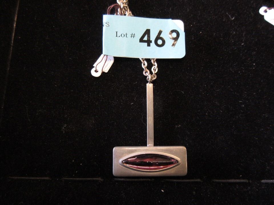 Single Amethyst Glass Center. Includes original chain. Pendant is 1.6" wide x 2.3" long.