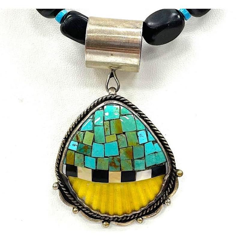 Authentic vintage Native American necklace by the acclaimed Kewa/Santo Domingo artist Joseph Tenorio. Features a spiny oyster shellsterling silver pendant with expertly inlaid turquoise, onyx, and shell. Pendant is signed and hallmarked on the back. Strung on a 21" necklace of onyx and turquoise heishi with sterling silver hook & eye closure. Total length: 21". Weight: 70 grams. A rare, collectible piece of handcrafted Southwestern jewelry-perfect for collectors or gift-giving. FREE SHIPPING ON ALL JEWELRY ORDERS WITHIN THE US! WE SHIP ALL ITEMS IN-HOUSE!