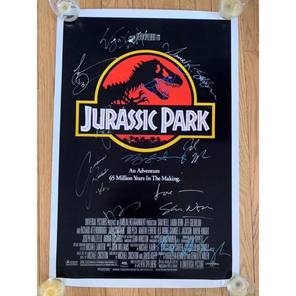 Signed by Sam Neill, Sir Richard Attenborough, Jeff Goldblum, Joseph Mazzello, Ariana Richards, Samuel L. Jackson, Wayne Knight, B. D. Wong, Miguel Sandoval and Steven Spielberg.