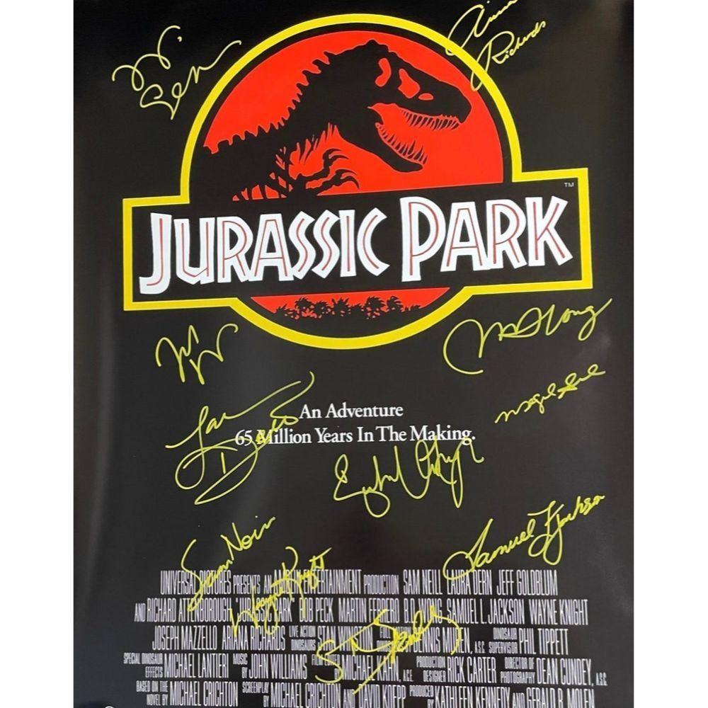 Signed by Sam Neill, Laura Dern, Sir Richard Attenborough, Jeff Goldblum, Joseph Mazzello, Ariana Richards, Samuel L. Jackson, Wayne Knight, Miguel Sandoval and Steven Spielberg.