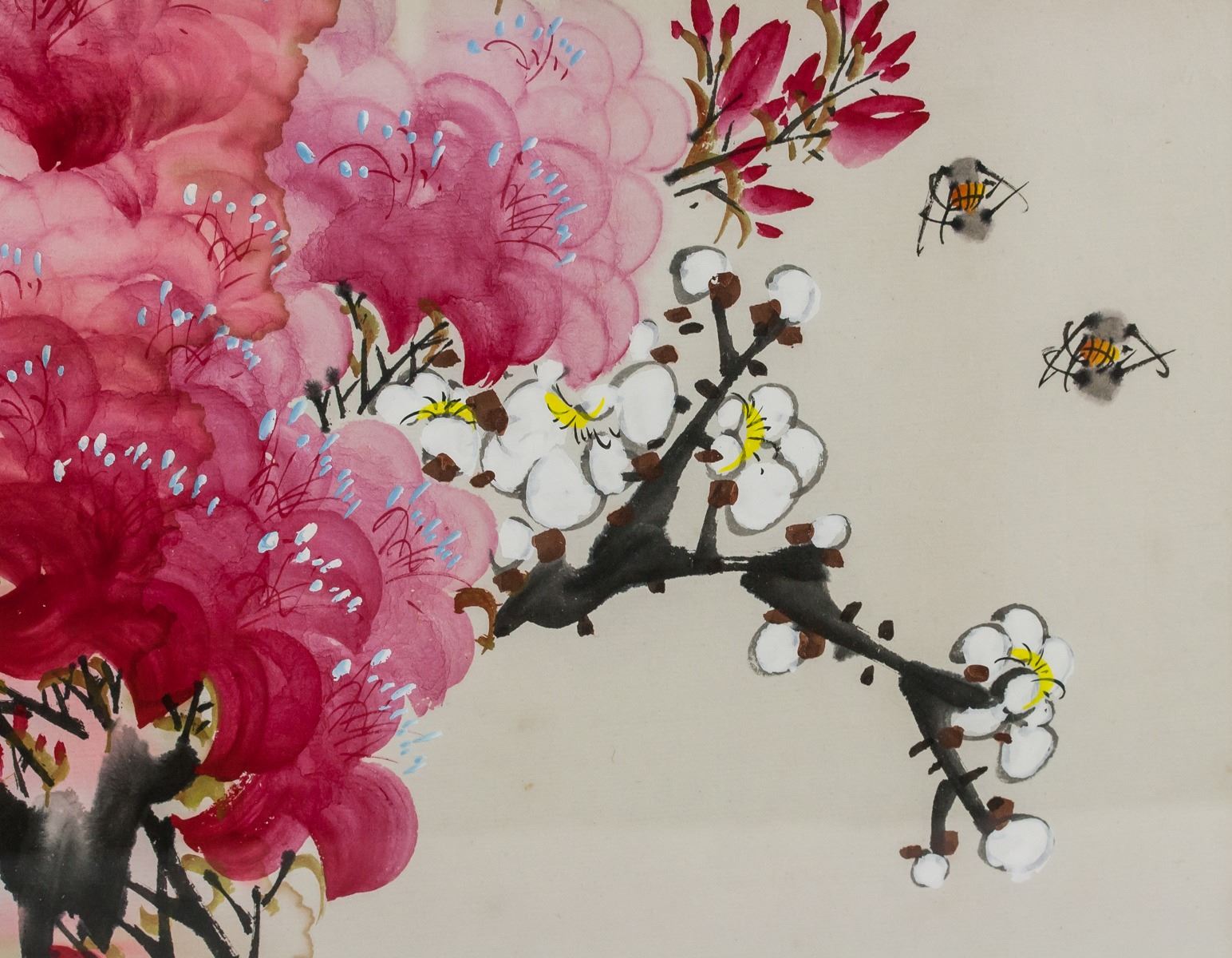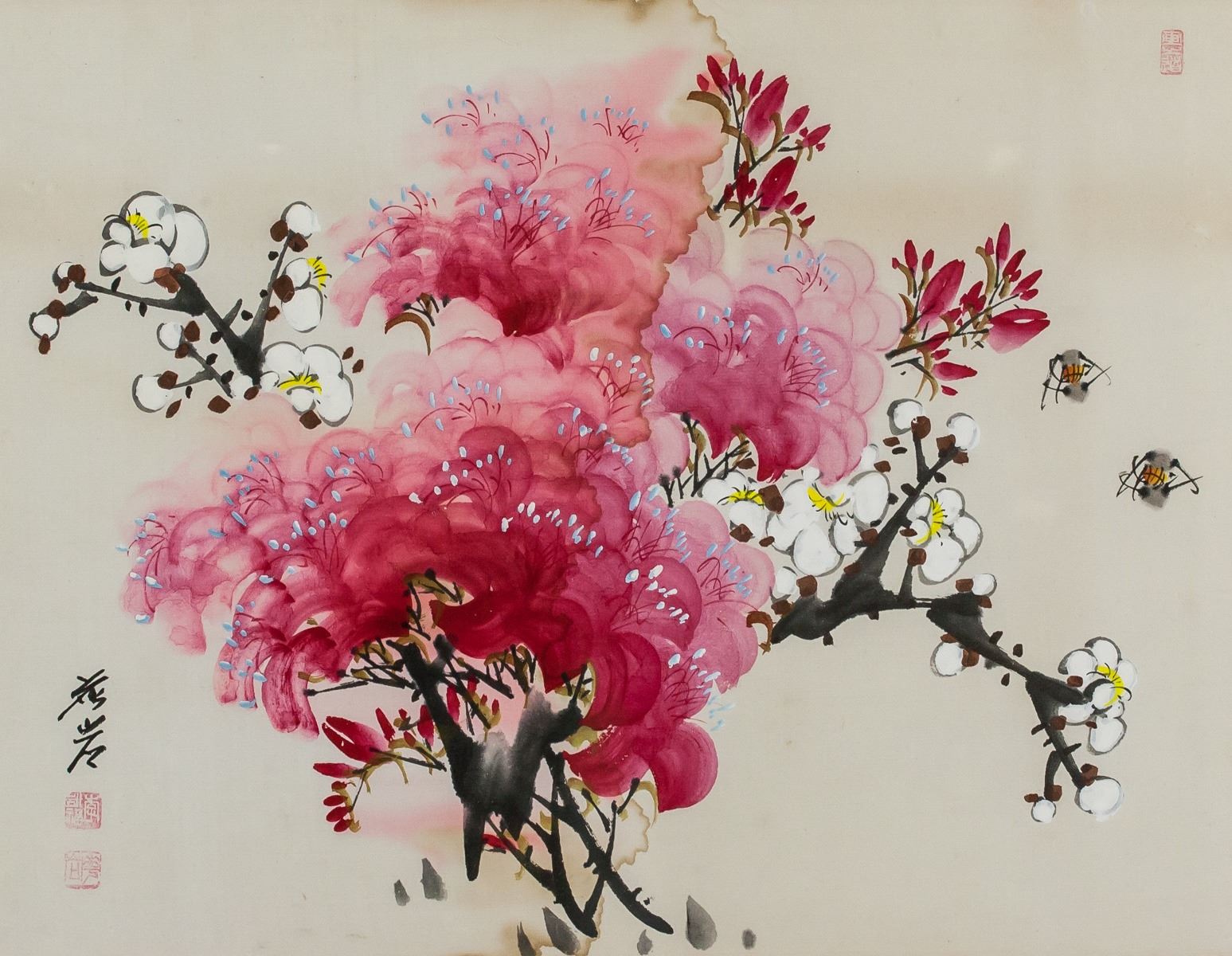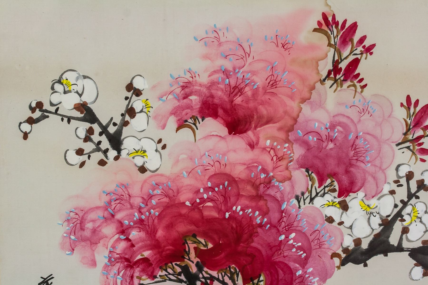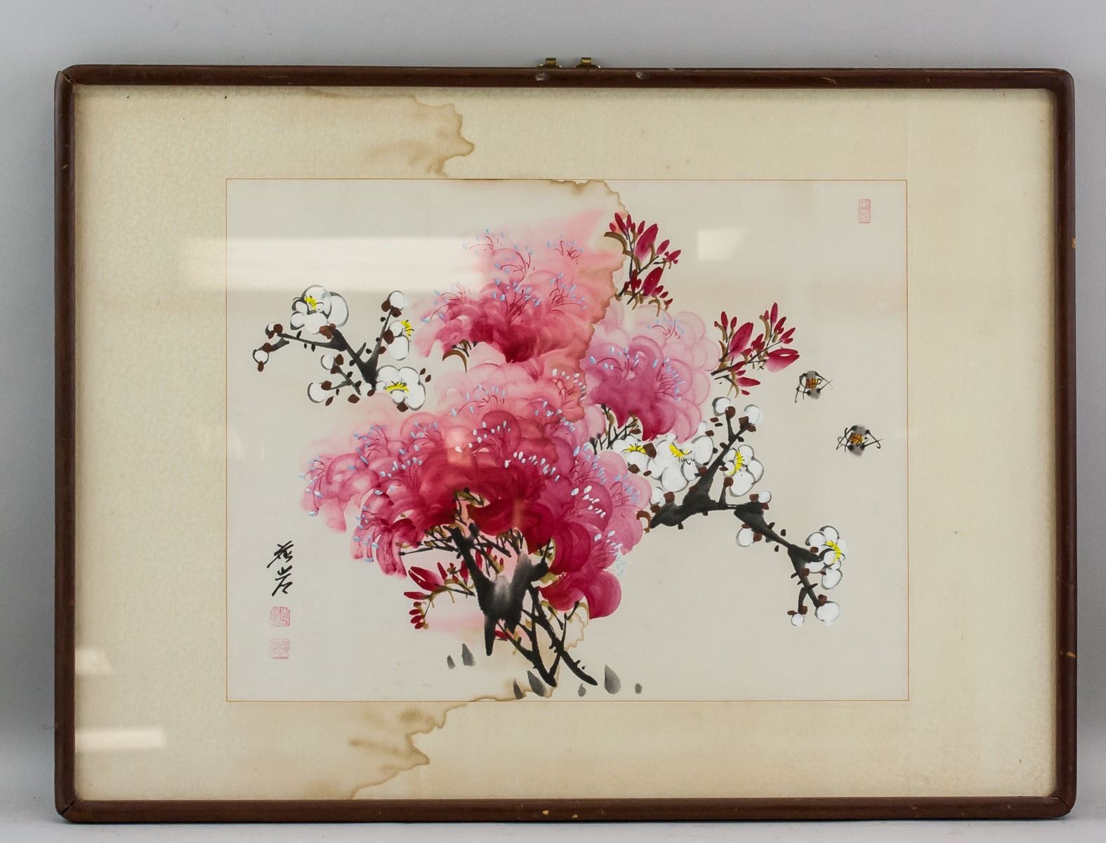 Watercolor on paper, framed. Featuring flowers in bloom. Signed and inscribed with two seals on the lower left corner. 43 x 32 cm, Frame: 63 x 45 cm