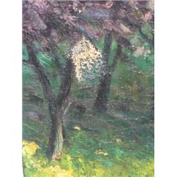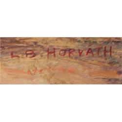 Signed L.B. Horvath American oil on canvas painting of landscape. L.B. Horvath was an American painter from New Jersey. Two small tears to left side that measure 1 1/2" each. Measures 38" x 32 1/4" unframed.