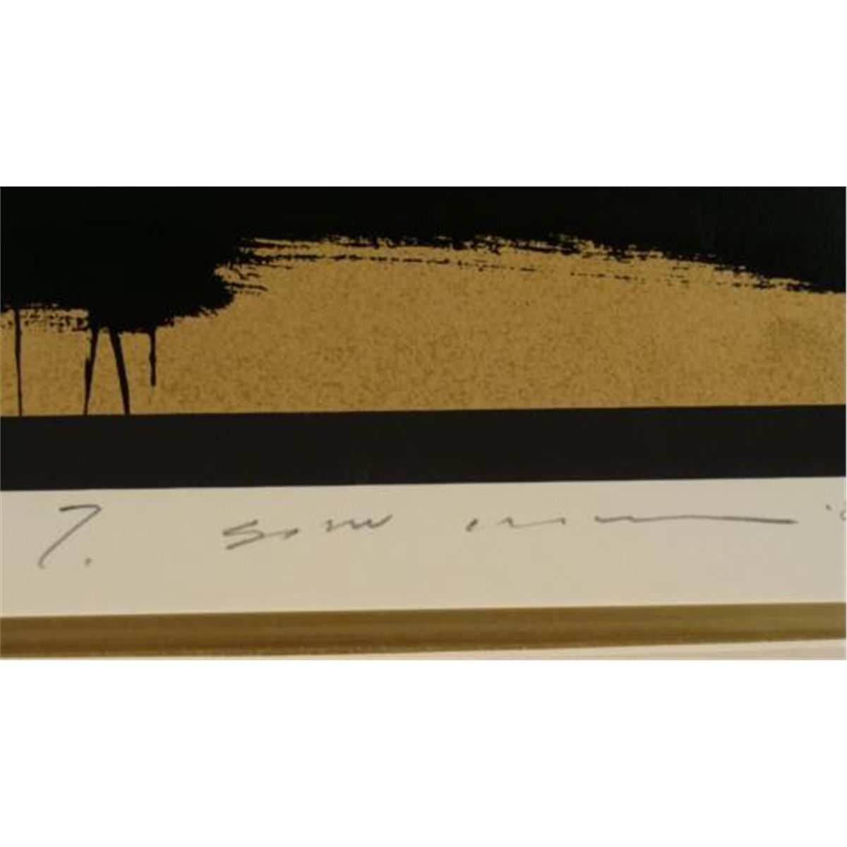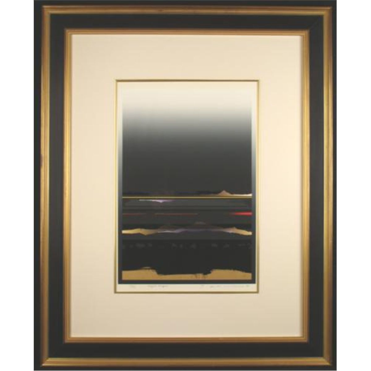 Offered here is a beautiful hand-signed, limited edition art print by famous Japanese artist, Tetsuro Sawada. This striking print, entitled, "Nightscape", demonstrates why Sawada is world renowned for his printmaking technique. The print comes with a wide gold and black panel frame and matting treatment. Title: "Nightscape" Serigraph on paper 1986 Hand signed by the artist, LR corner Numbered 112/220 in pencil by the artist, LL corner Image Size: 16 inches x 23 inches Frame Size: 34 inches x 42 inches From a limited edition of 220 Condition of image: Excellent Condition of Frame: Good, some nicks and scratches consistent with age. Some chipping of the wood at the corners. Ready to hang Certificate of Authenticity issued by Midwest Estate Buyers * A master of "bokashi" (shading), the most difficult technique in the medium of silkscreen, Sawada inked and self-printed all of his own prints. The results are always striking and harmonious contrasts of high gloss and matte colors of great depth and beauty. * Often referred to as "the skyscape artist," the work of Tetsuro Sawada (Japan, 1935 - 1999) is held in numerous public collections, including the Cleveland Museum of Art; British Museum; Cincinnati Art Museum; Honolulu Academy of Art, Honolulu, and the Queensland Art Museum, Australia, as well as many prestigious private and corporate collections.
