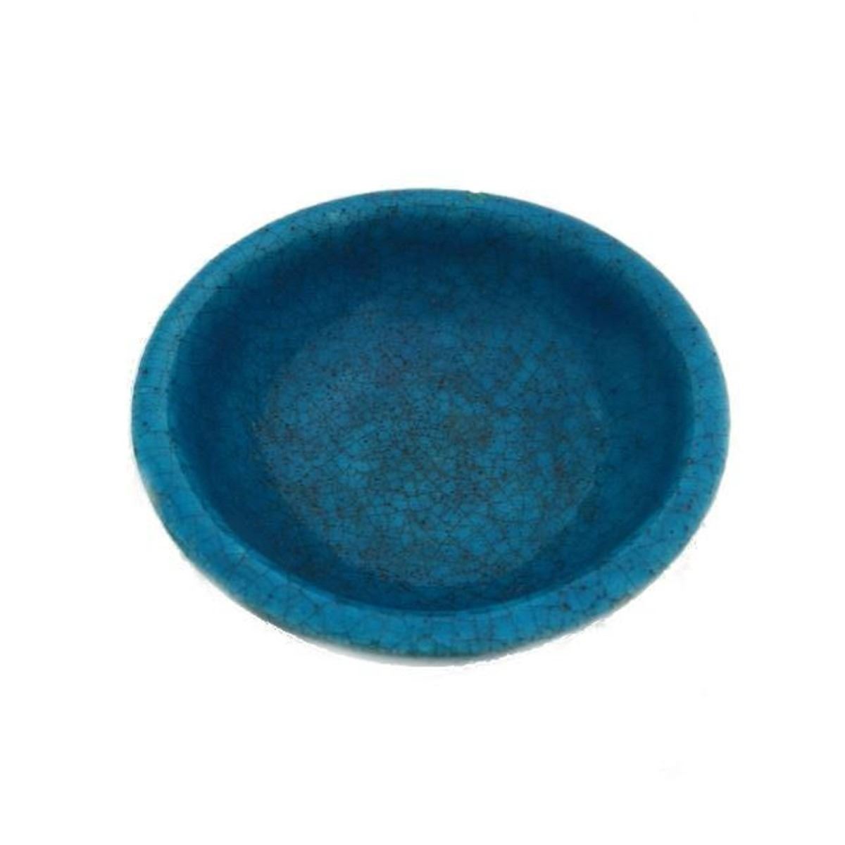 Set of 2 modernist Persian blue crackle bowls, both signed on the bottom. The larger bowl ( 4 1/2" D ) is signed Lachenal. The smaller bowl or cup has lettering on the bottom that appears to read "FRANCE". It issimilar to the larger & we have attributed it to the Lachenal French studio as well. Lachenal French Pottery was first produced in the late 19thc by Edmond Lacheral. In 1911, his son Raoul established his own potteryworks. These bowls are from this time ( 1911-1950's ). **Lachenal pottery is known for for simple lines, bold color, craquelure & organic texture.** The larger bowl has only minor rough spots around the edge of the lip. The smaller bowl/ cup ( 2 3/4" D ) had previously been broken in 2 places & repaired. The repair on this one is very visible, but still makes anice collectible. The reserve price reflects this damage.