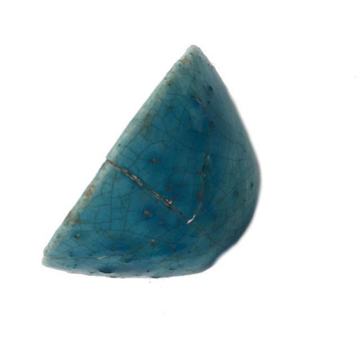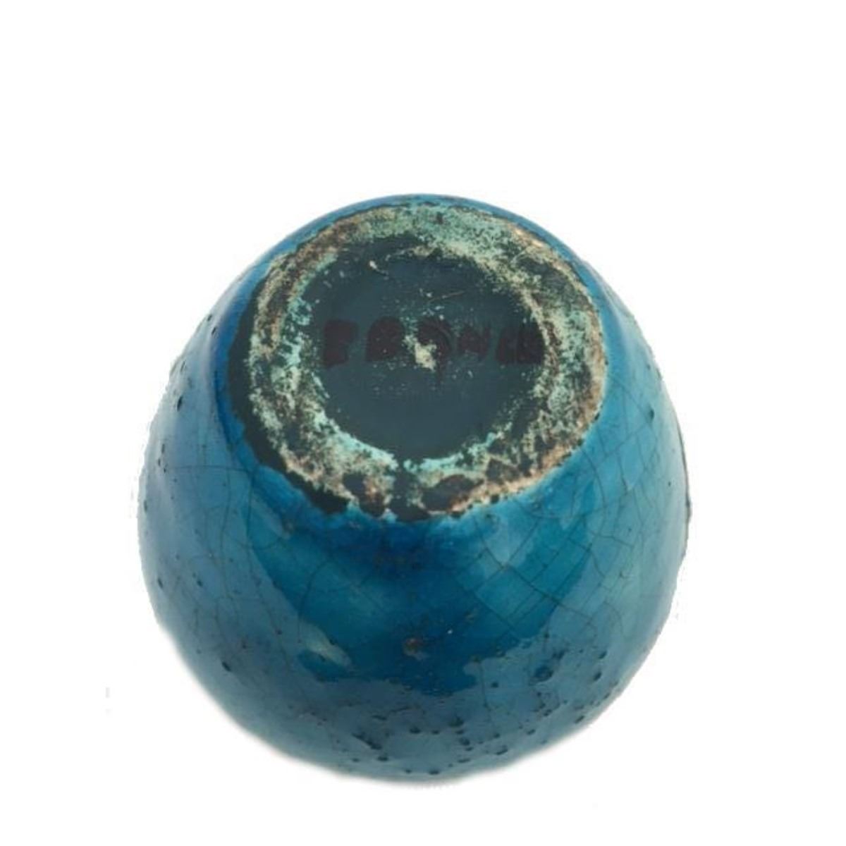 Set of 2 modernist Persian blue crackle bowls, both signed on the bottom. The larger bowl ( 4 1/2" D ) is signed Lachenal. The smaller bowl or cup has lettering on the bottom that appears to read "FRANCE". It issimilar to the larger & we have attributed it to the Lachenal French studio as well. Lachenal French Pottery was first produced in the late 19thc by Edmond Lacheral. In 1911, his son Raoul established his own potteryworks. These bowls are from this time ( 1911-1950's ). **Lachenal pottery is known for for simple lines, bold color, craquelure & organic texture.** The larger bowl has only minor rough spots around the edge of the lip. The smaller bowl/ cup ( 2 3/4" D ) had previously been broken in 2 places & repaired. The repair on this one is very visible, but still makes anice collectible. The reserve price reflects this damage.