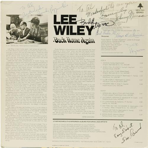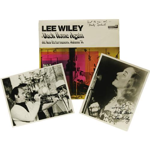 <B>Signed "Lee Wiley - Back Home Again" Monmouth-Evergreen Records MES/7041 Stereo LP, with Autographed Al White Silver Print (1971).</B></I> Singer Lee Wiley interprets the standards with sidemen Rusty Dedrick (trumpet), Johnny Mince (clarinet), Buddy Morrow (trombone), Dick Hyman (piano), Bucky Pizzarelli (guitar), George Duvivier (bass), and Don Lamond (drums). The album cover was signed by all of the sidemen. Also included in this lot are an Al White "jazz party" silver print, autographed by Dedrick, and a publicity photograph, autographed by Lee Wiley. Condition: VG+/VG. <I>From the Al White Jazz autograph archive.</B></I>