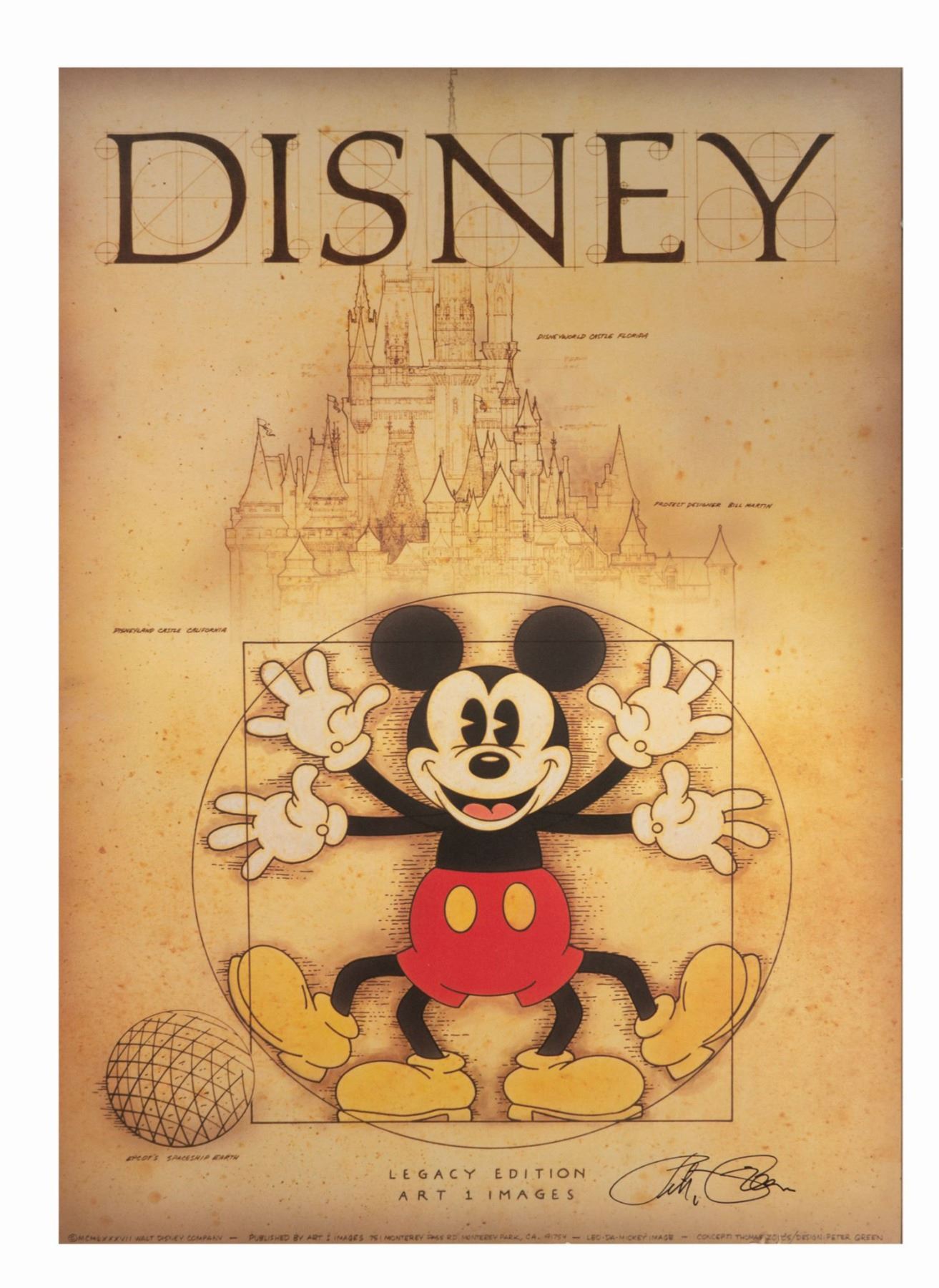 (Disney, c.1984-85) An original high-quality art print titled "Leo Da Mickey" that is signed by the poster's artist, Peter Green. This piece was created by Green in partnership with Disney, and was created by using original blueprints from Disney for Sleeping Beauty Castle. Depicting Mickey as the "Vitruvian Man" by Leonardo Da Vinci, this giclee print comes from Green's personal collection and is adhered to board for display. Measuring 36"x24", the giclee print is in good condition with some minor wear around the edges from use and display by Green.