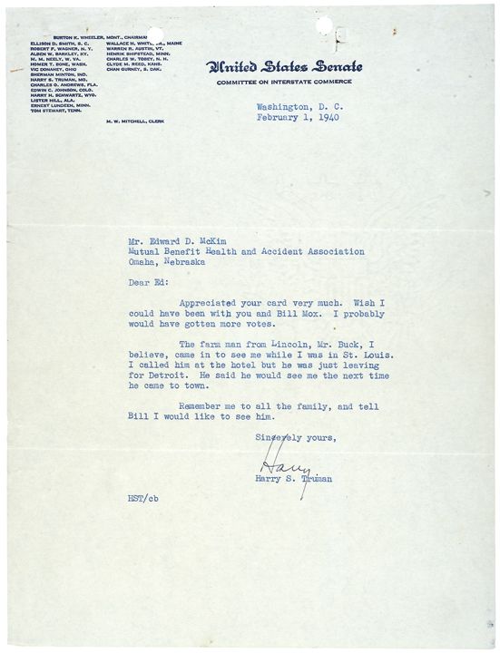 Senator Harry S. Truman Thanks a Supporter from Lincoln, Missouri