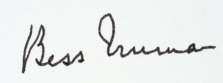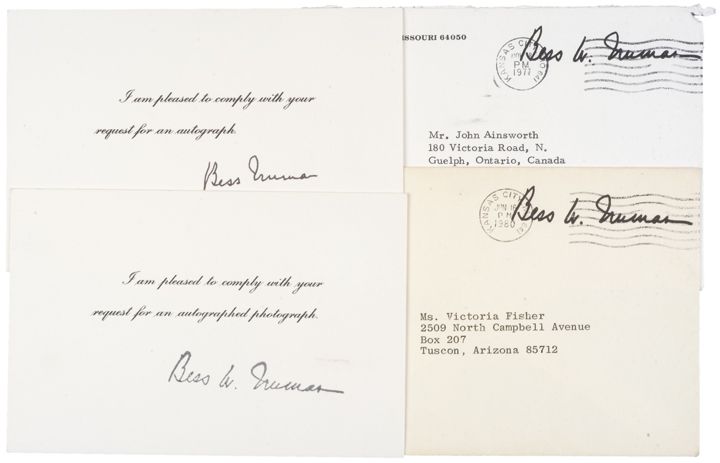 February 1, 1940, Typed Letter Signed, “Harry”, in black ink on United States Senate letterhead, Washington, DC, 10.25” x 8”, Very Fine. Addressed to Edward McKim of the Mutual Benefit Health and Accident Association. The letter has two docketing holes at the top, not affecting the signature at the bottom. Interesting signature of Senator Truman—before he became vice president under FDR! This lot includes an autographed card by Bess Truman in black ink, no date, measuring 4” x 6”; two envelopes with free-franked stamped “Bess W. Truman” facsimiles (1977 and 1980) from Kansas City; and a 4” x 6” card stamped with a facsimile of her signature. Items have minor wear.