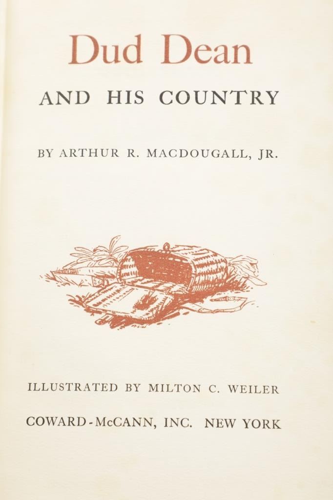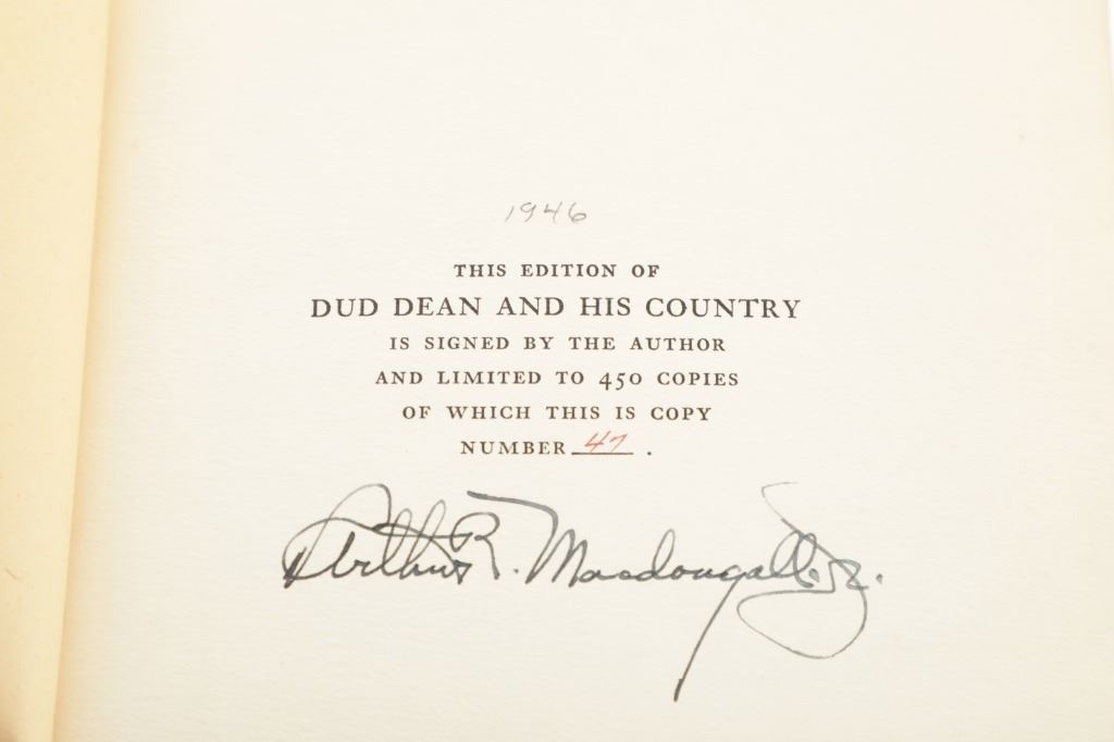 Presented in this lot is the signed Limited Edition (#47 of 450) book, "Dud Dean And His Country", by Arthur R. Macdougall. Macdougal, who won many friends and admirers through the pages of Field & Stream magazine in the 1920s and 1930s, has become a legendary figure in Maine sporting fiction through his collections of short stories on fly fishing featuring the famous fictional character and Maine Guide, Dud Dean. Mak, as Macdougall was known by his friends, was a constant presence in the Dud Dean stories and told them in the first person. In typical fashion, he and Dud would often be out on some trout water, or headed that way, and Dud would get to telling stories. Dud was an incredible story teller, but not because he stretched the truth. On the contrary, Dud’s honesty was refreshing. It was the way he described the setting and the people in his stories, in the unexpected clarity of his somewhat broken Maine dialect, that made them so appealing. In any Dud Dean tale, Macdougall had the uncanny ability to really make you feel like you were there, in the Maine woods, walking alongside Dud, Mak, and their companions. In addition, the era in which these stories were based adds even more appeal. Reaches of the Kennebec River, area streams, lakes and ponds were described in a time when roads, houses, dams and other signs of encroaching civilization were much less pronounced. Most places required a train ride or long walk from Bingham for a day’s fishing. Even though cars began to arrive on the local scene, roads on which to drive them were scarce. Waterways were still a major means of transportation, including the shipment of millions of logs downriver to the mills. And, at least in the Dud Dean stories, the fishing was much, much better.