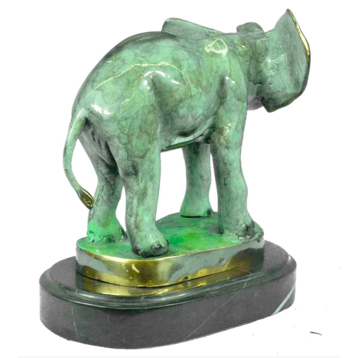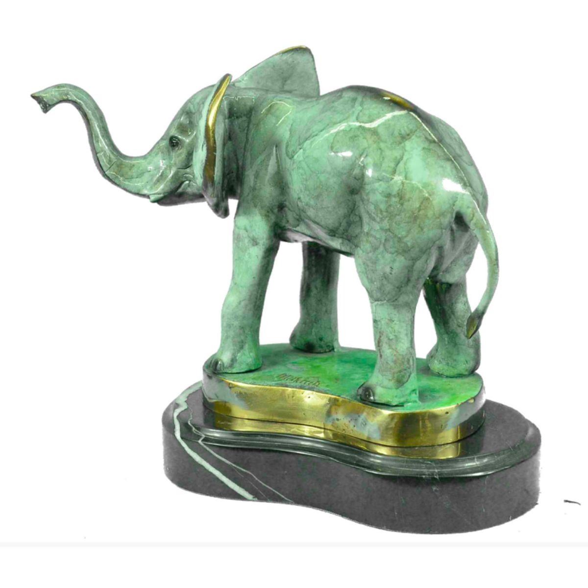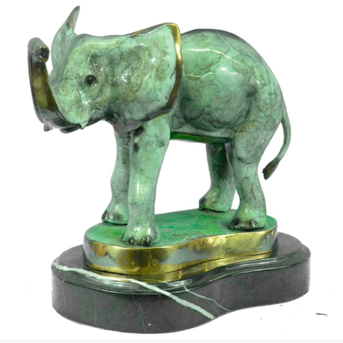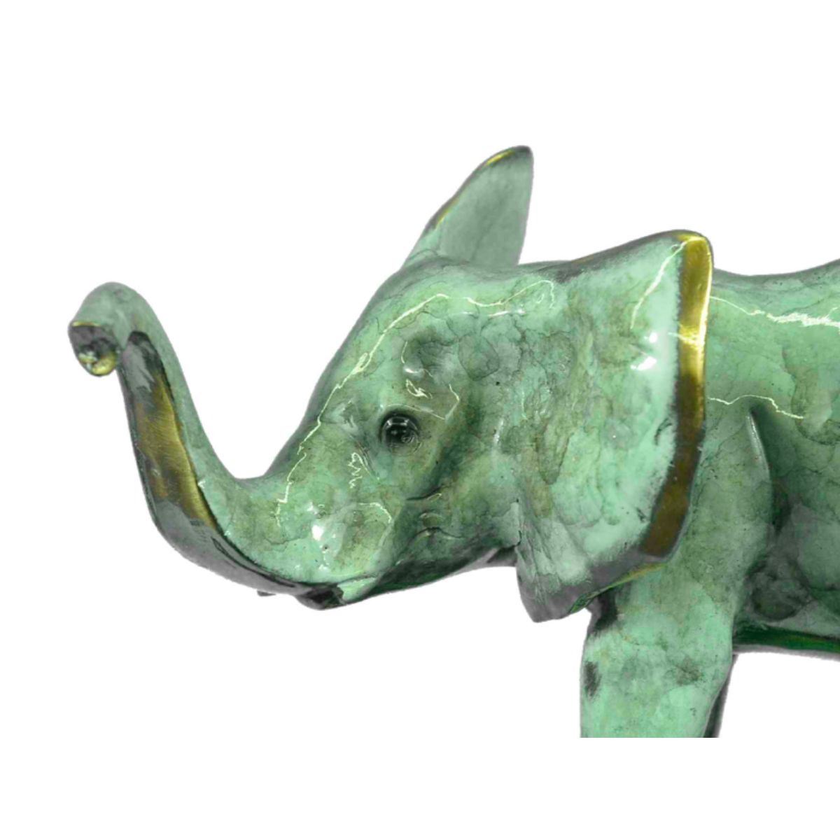 Limited Edition elephant sculpture. Lost wax casting method bronze, with baked, glazed green patina with gilt, mounted on marble base. Original limited edition sculpture, signed by the artist, Marius, at the base. 10" H x 14" W. 12lbs.