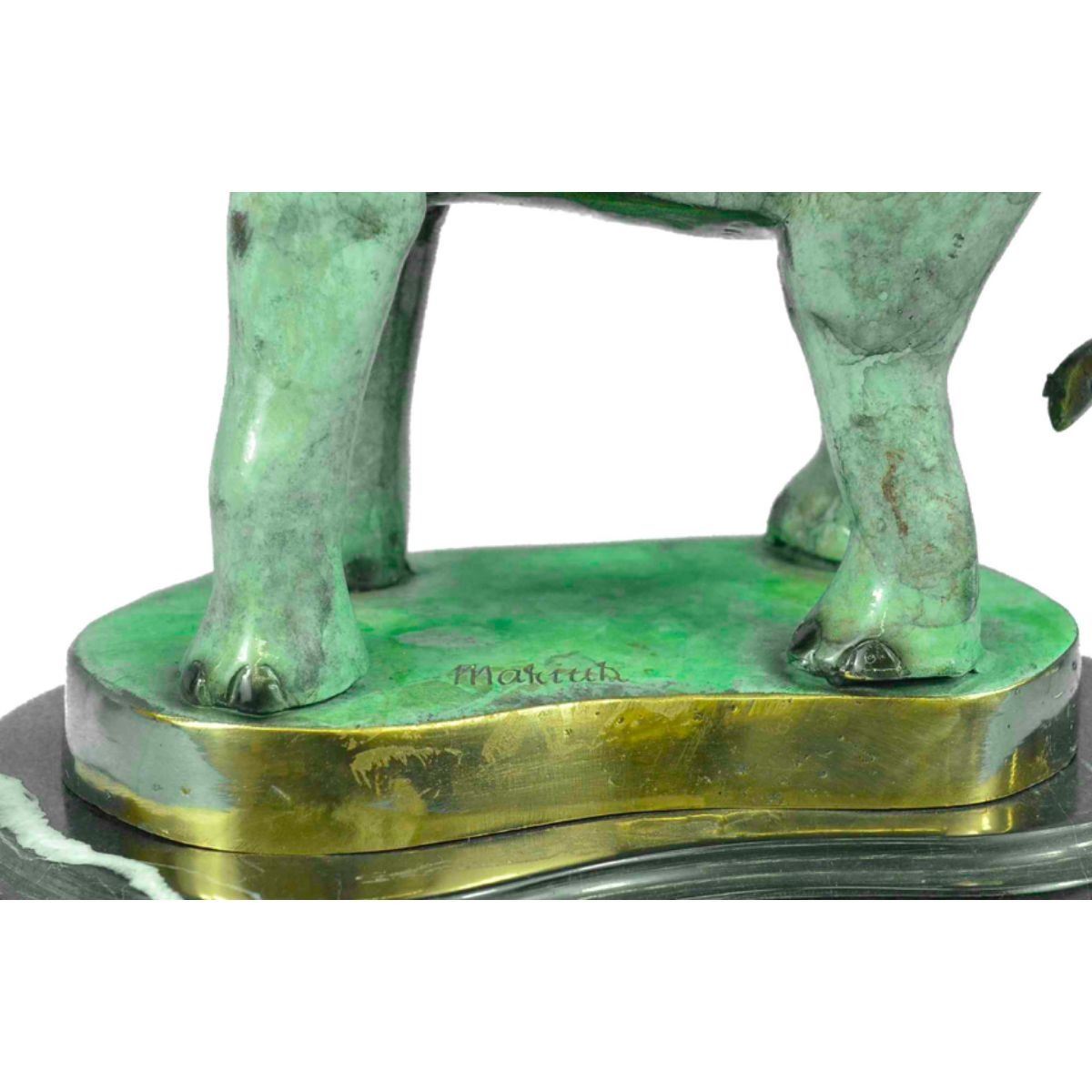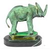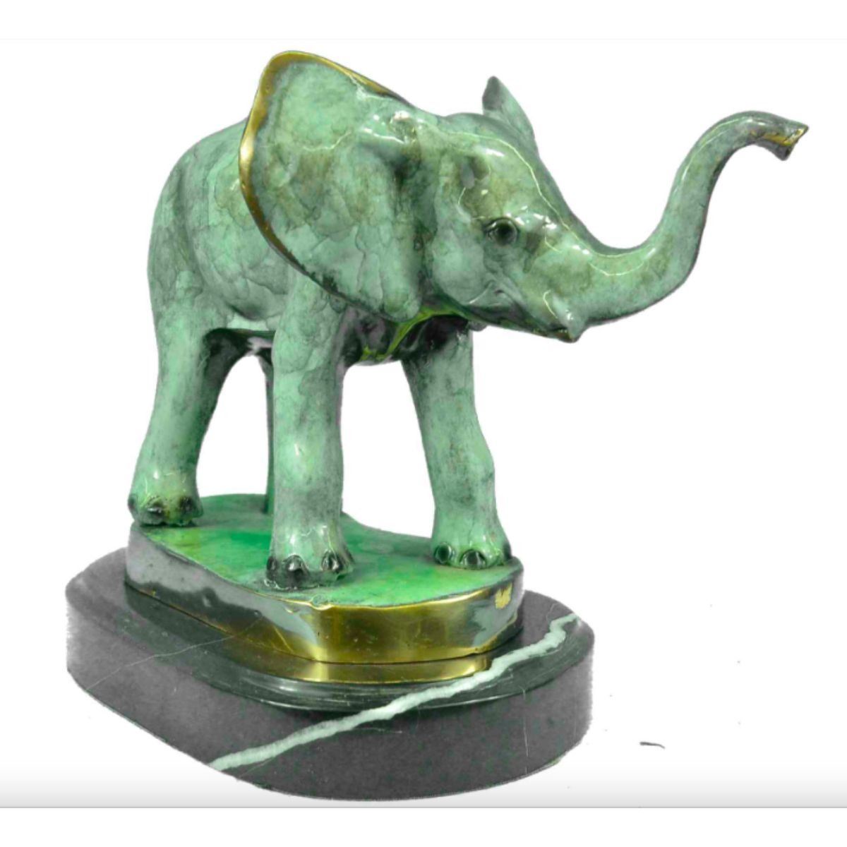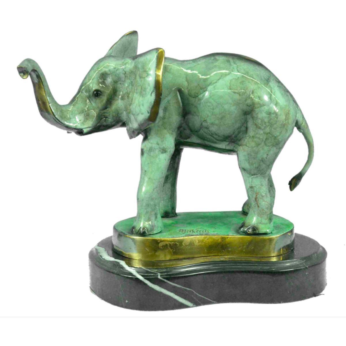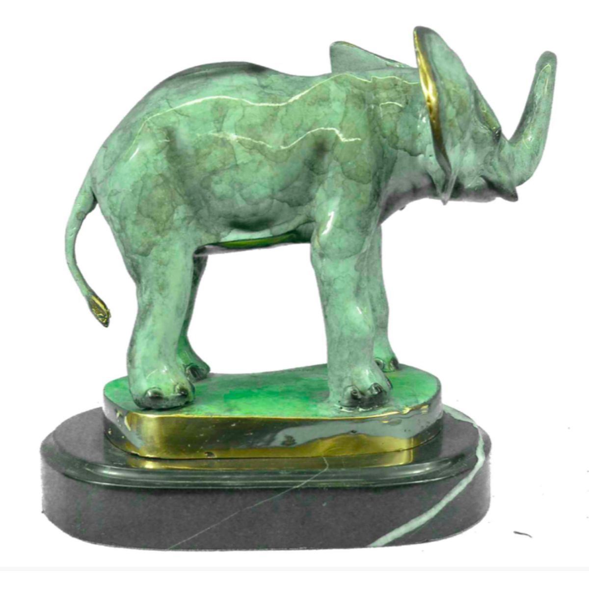 Limited Edition elephant sculpture. Lost wax casting method bronze, with baked, glazed green patina with gilt, mounted on marble base. Original limited edition sculpture, signed by the artist, Marius, at the base. 10" H x 14" W. 12lbs.