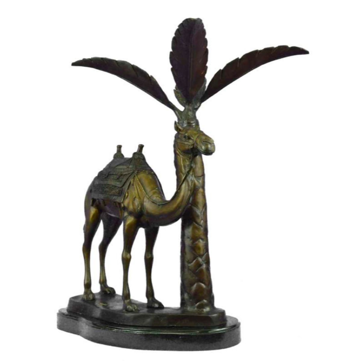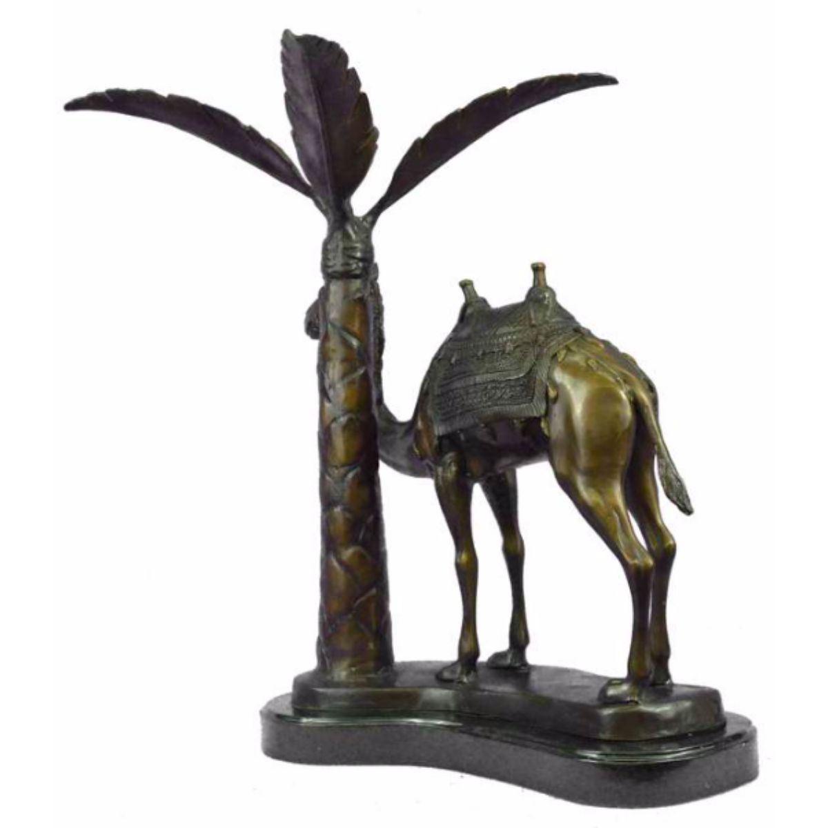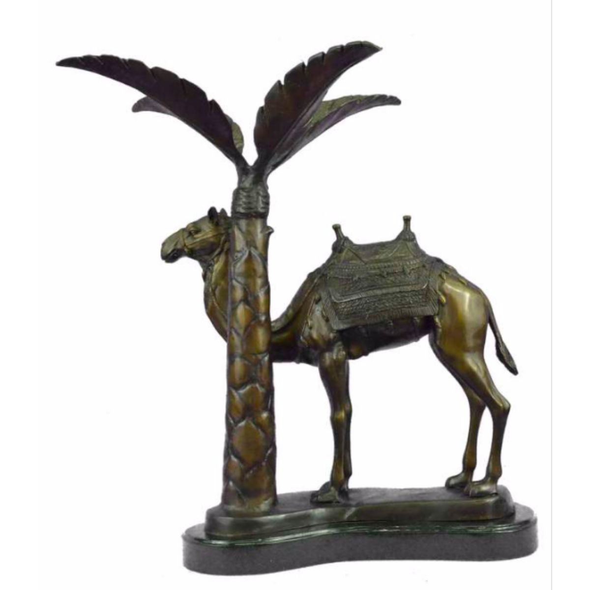 Signed by the artist, Marius, large size, original limited edition sculpture of a Camel resting in a Desert Oasis. Lost wax casting method bronze, with grown, green & gold patina, mounted on a marble base. 26" H X 27" W. 36lbs.