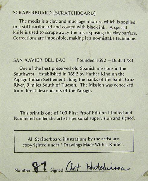Signed Limited Edition Print By Art Hutchinson. Framed in a wood frame, matted, under glass. Measures approx. 8'' x 11''. Picture is of ''San Xavier Del Bac'' (Tucson, Arizona) founded 1692-Built 1783. This print is one of 100 First Proof Edition Limited and Numbered under the artist's personal supervision and signed. Information on back. SHI $35.