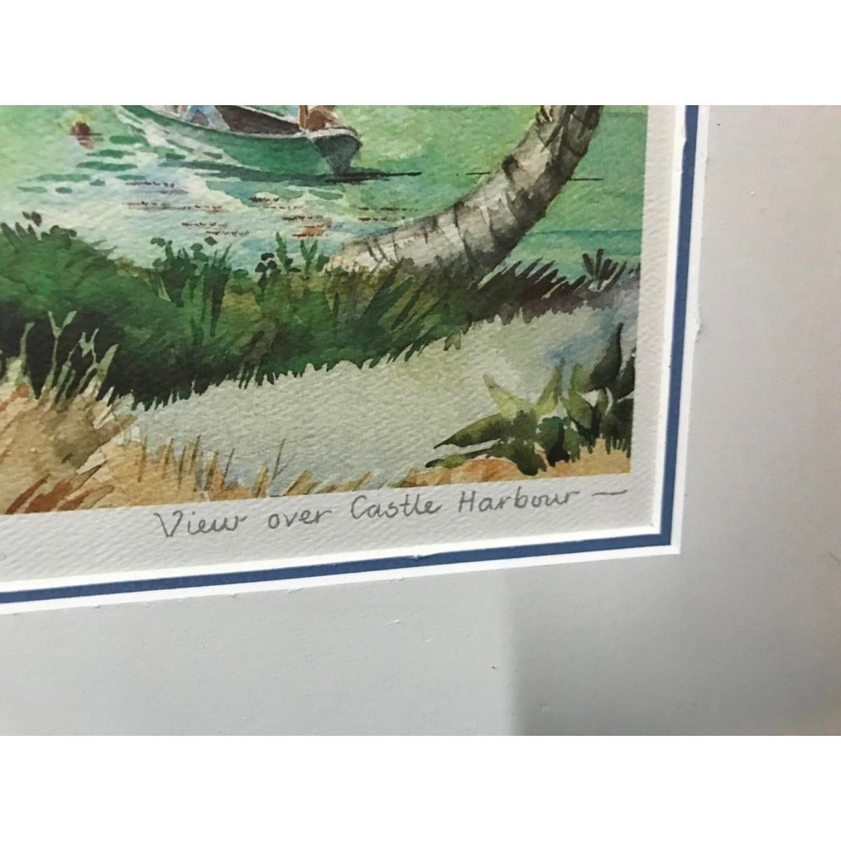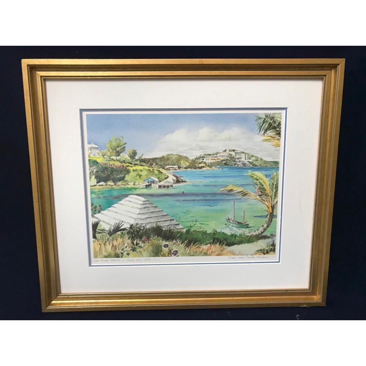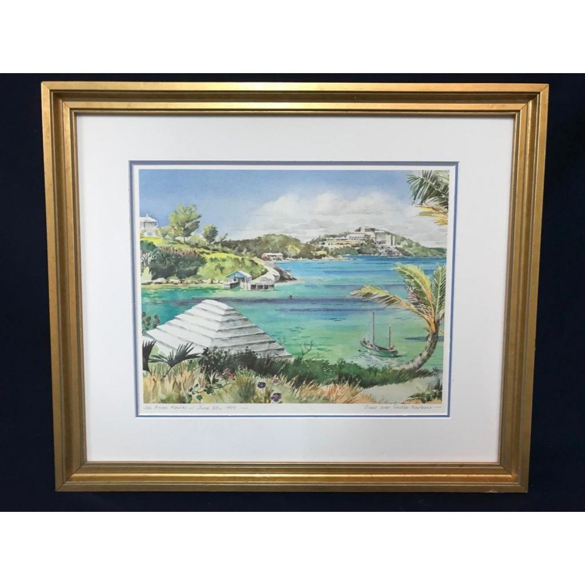 Limited Lithograph, "View Over Castle Harbour" hand signed & dated in pencil by listed artist, Jill Amos Raine, 1999. Double matted with gold frame. 17" X 20". *frame without glass. Castle Harbour is a large, natural Harbor in Bermuda that's located between the northeastern end of the main island and St. David's Island. Originally called Southampton Port, it was renamed as a result of its heavy fortification in the early decades of the Seventeenth Century.Â