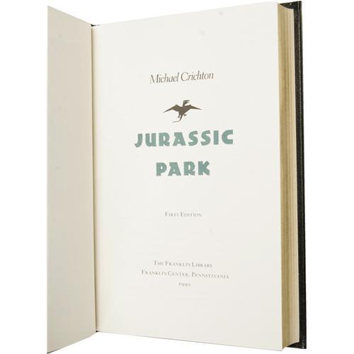 <B>Michael Crichton Signed Limited <I>Jurassic Park.</B></I></B></I> (Franklin Center: The Franklin Library, 1990), limited first edition exclusively for the members of the Signed 1st Edition Society, 400 pages, bound in black leather with gilt titles and decoration, gilt edges, marbled endpapers, 8vo (6.5" x 9.5"), signed "<I>Michael Crichton</B></I>" on the second free endpaper, in fine condition.<BR><BR><b>Shipping:</b> Books & Catalogs (<a target="_blank" href="http://www.heritageauctions.com/common/shipping.php">view shipping information</a>)