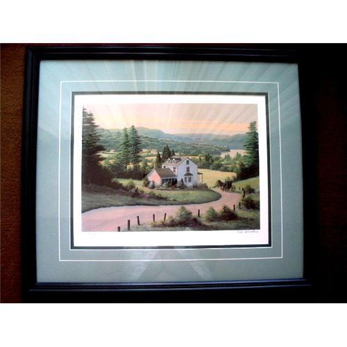 Artist signed and numbered, 70 of a limited edition of 500. Titled "Hillside View" - Realism. A horse drawn buggy winds it's way along a country lane, lots of greenery - a very soothing and serene country scene, actual image size is 9 x 12-1/2. Framed size is 18x21. Comes with a Certificate of Authenticity, signed by the artist. The mat is a soft green color and the frame is a dark forest green color.