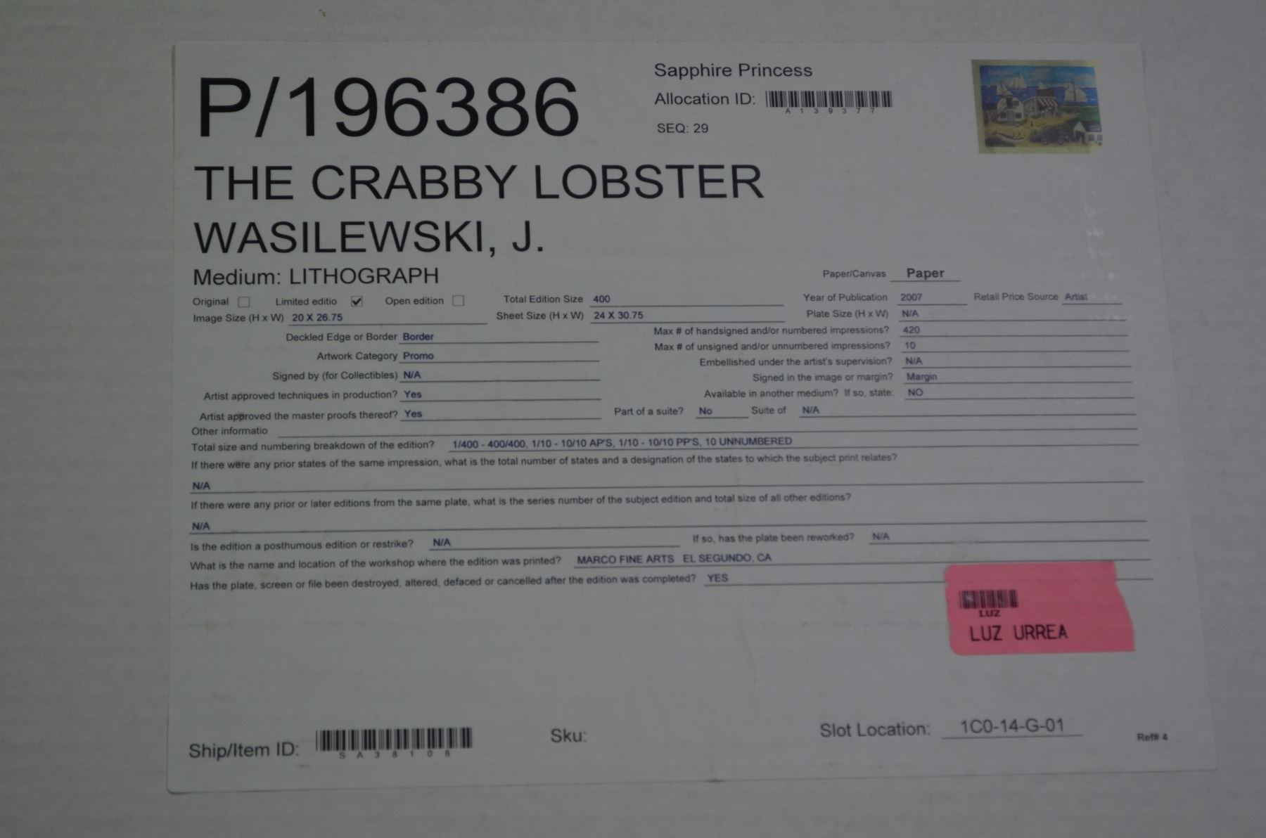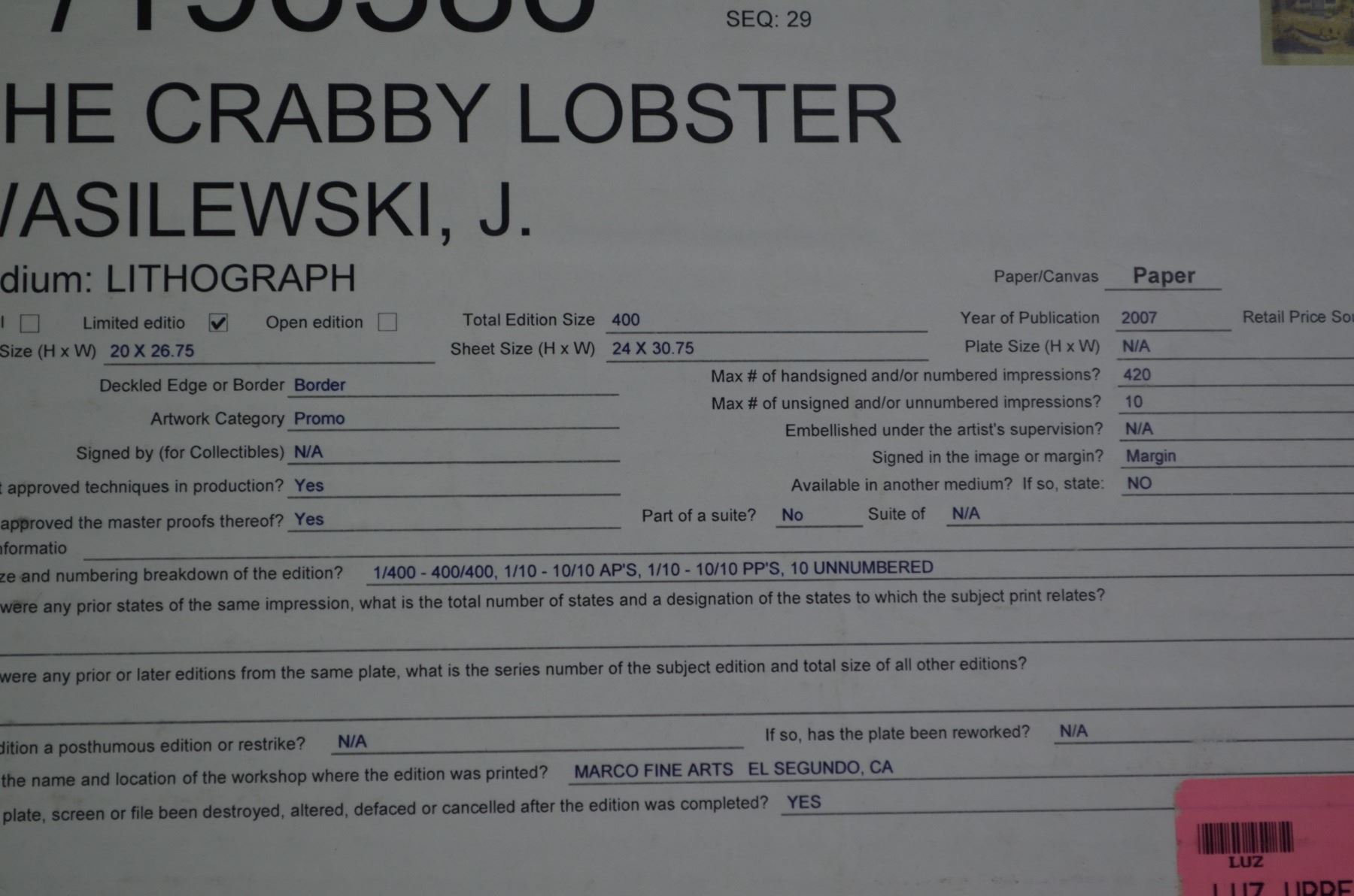 The Crabby Lobster. Signed limited edition. 20 x 26.75". Mounted on cardboard. NO SHIPPING