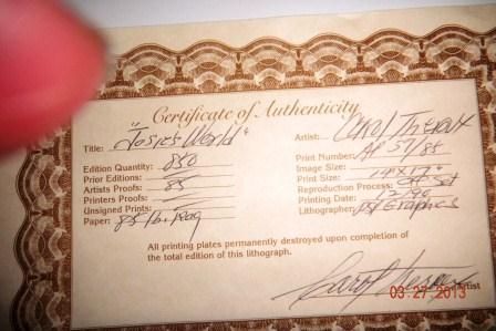 Picture is entitled "Josie World" This is Artist Proof No. 57/88. Print size is 14x17 inches. Frame Measures 22x24 inches. Certificate of Authenticy. Shipping $30.00