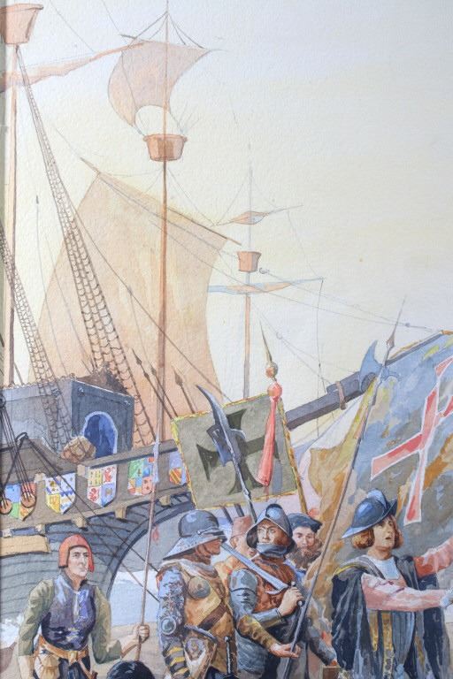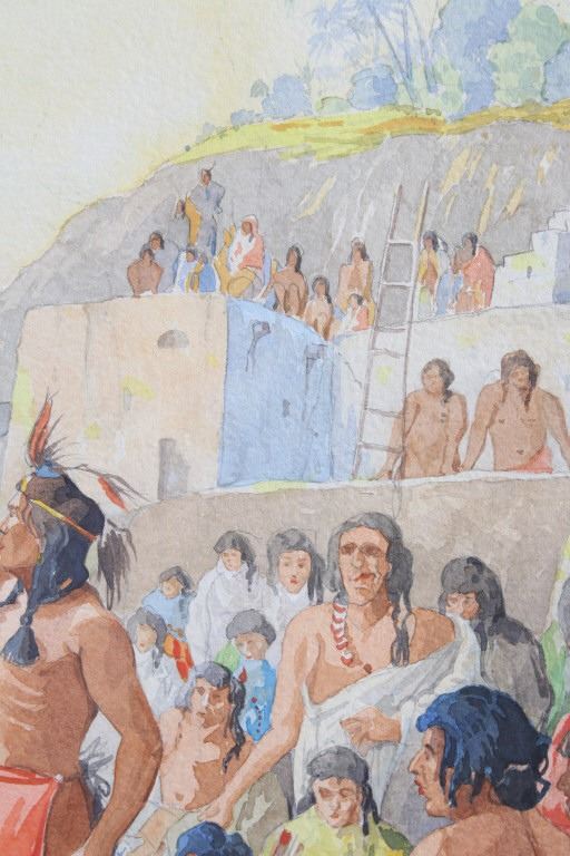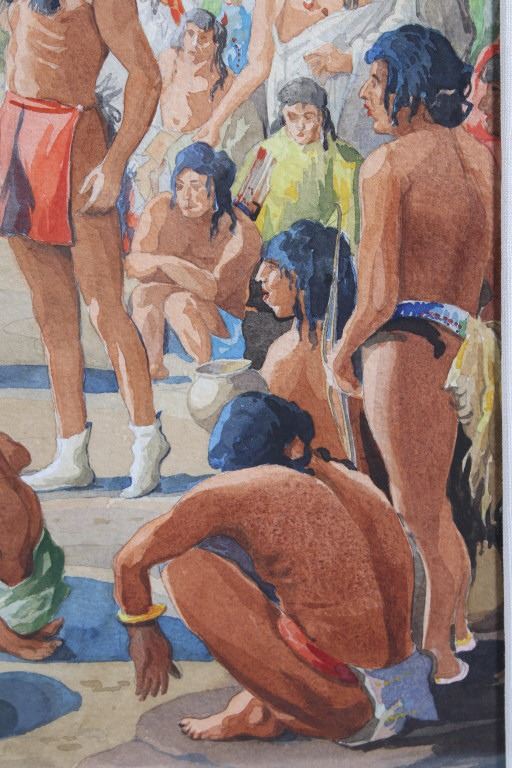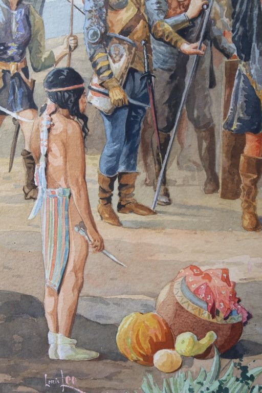 Included in this lot we have a original signed Louis Mathias Leo framed watercolor painting titled "The Landing Of Columbus". Louis Mathias Leo was an Austrian artist and painter. He was born in 1871 in Austria, moved to Los Angeles in 1906 and passed away in 1958. The piece depicts the first meeting of Columbus and the Natives in the New World. The painting shows Columbus and six of his crew holding flags and weapons, as Columbus points at the gathered crowd. The Native Islanders are shown gathered near the shore and are presenting gifts to the crew as the leader points off to the sea. This original watercolor shows exceptional detail and wonderful coloration. The piece is signed in the bottom left hand corner reading "Louis Leo". The painting is set into a golden frame with floral patterns across the corners and a off white border around the painting. The painting shows its original art gallery tag and is priced at $2,250. Provenance: From the renowned Sundog Fine Art Bozeman, Montana collection and collected by Bruce VanLandingham. Bruce VanLandingham was a pillar in the American Indian collecting community and a respected expert. Along with being an avid collector Bruce also was the sole owner of Sundog Fine Art Gallery in Bozeman which was both part museum and gallery. The piece shows very good condition overall with some light wear across the frame. The frame measures 29 1/2" wide by 38 1/2" tall with the art measuring 21 1/2" wide by 30 1/4" tall.