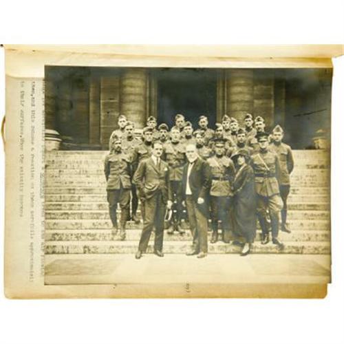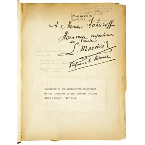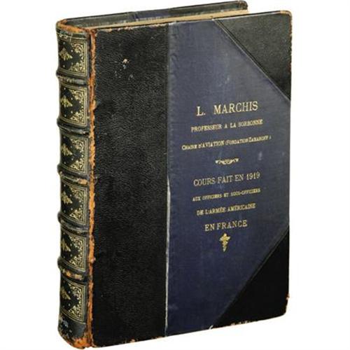 <B>Early Unpublished Aviation Tutorial,</B></I> <I>Cours Fait En 1919 Aux Officiers et Sous-Officiers De L'Armee Americaine en France,</B></I> by Professor Lucien Marchis, 313 pages with three supplementary fold-out blueprints, two group photos of aviators and a 16-page lecture by Colonel Durand of the French War Office, 4to (8" x 11"), blue cloth and calf boards, tooled gilt title on cover, gilt on compartmentalized spine, blue marble endpapers, inscribed "<I>A Monseiur Laharoff, Hommage respect (ier) de l'auter, L. Marchis, Professeur a la Sorbonne.</B></I>" Ex. Libris: Imperial College Union Library. Some chipping and wear to extremities on cover, minor loss to front free endpaper , otherwise internally fine with tight binding. Very good condition. This is an exceptional overview of military flight as it existed during the immediate aftermath of WWI.<BR><BR><b>Shipping:</b> Books & Catalogs (<a target="_blank" href="http://www.heritageauctions.com/common/shipping.php">view shipping information</a>)