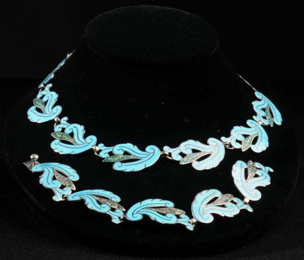 Description Includes sterling and enamel necklace, bracelet, and screw-back earrings. Condition (Excellent). Size Necklace: 16 - 1/4" L.