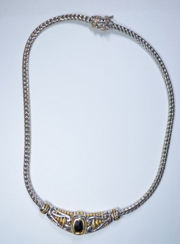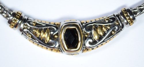 Signed "MX" necklace with magnetic clasp, also safety clasp. 16" long. Two tone metal with a faux amethyst in the center. Like new.