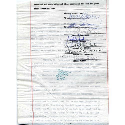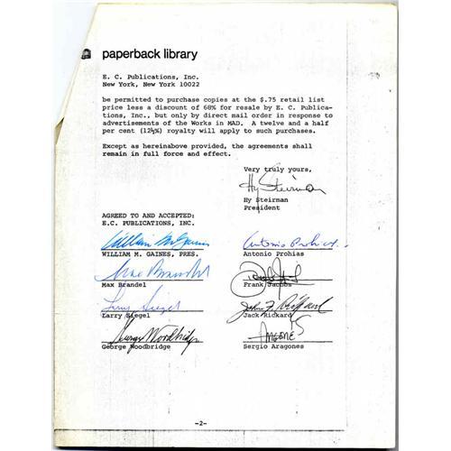 <B>Signed Mad Magazine Contract for "The Mad Turned On Zoo" (Coronet Communications, 1971).</B></I> Looking for a few choice <B>Mad</B></I> autographs to add to your collection? Look no further, 'cause we gotcha fixed up with this fascinating lot. This signed agreement between EC and Paperback Library's parent corporation, Coronet, includes "John Hancock"s by William Gaines, Max Brandel, Larry Siegel, George Woodbridge, Antonio Prohias, Frank Jacobs, Jack Rickard, Sergio Aragones, Al Jaffee, Bob Clarke, Jerry DeFuccio, and more! Dated October 20, 1971, the papers remain in Very Good condition, with all signatures in Excellent condition.