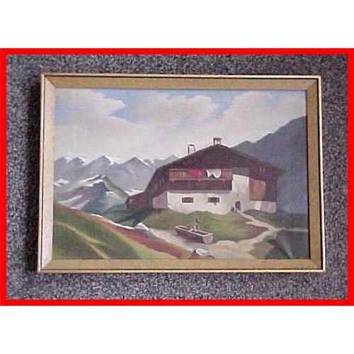 This 10-3/8" tall by 15-1/8" long landscape oil painting on canvas is framed with a simply 11-1/2" by 16" frame. Written on the bottom of this painting is "Mangold"; possibly Norman Mangold of Nebraska. This landscape painting shows a cabin with a mountain range in the background. I bought this Deco style landscape in an antique shop in Fargo, North Dakota several years ago.