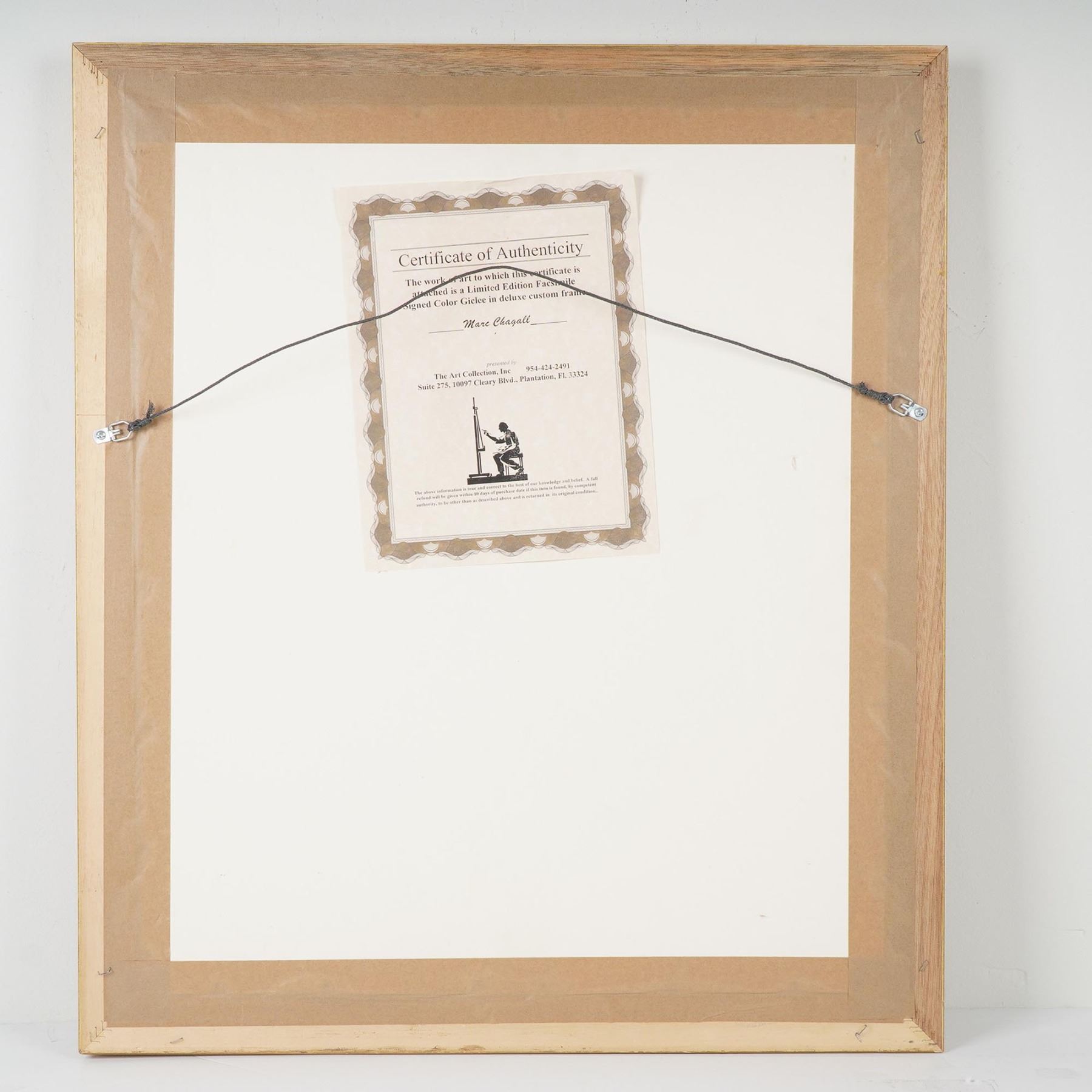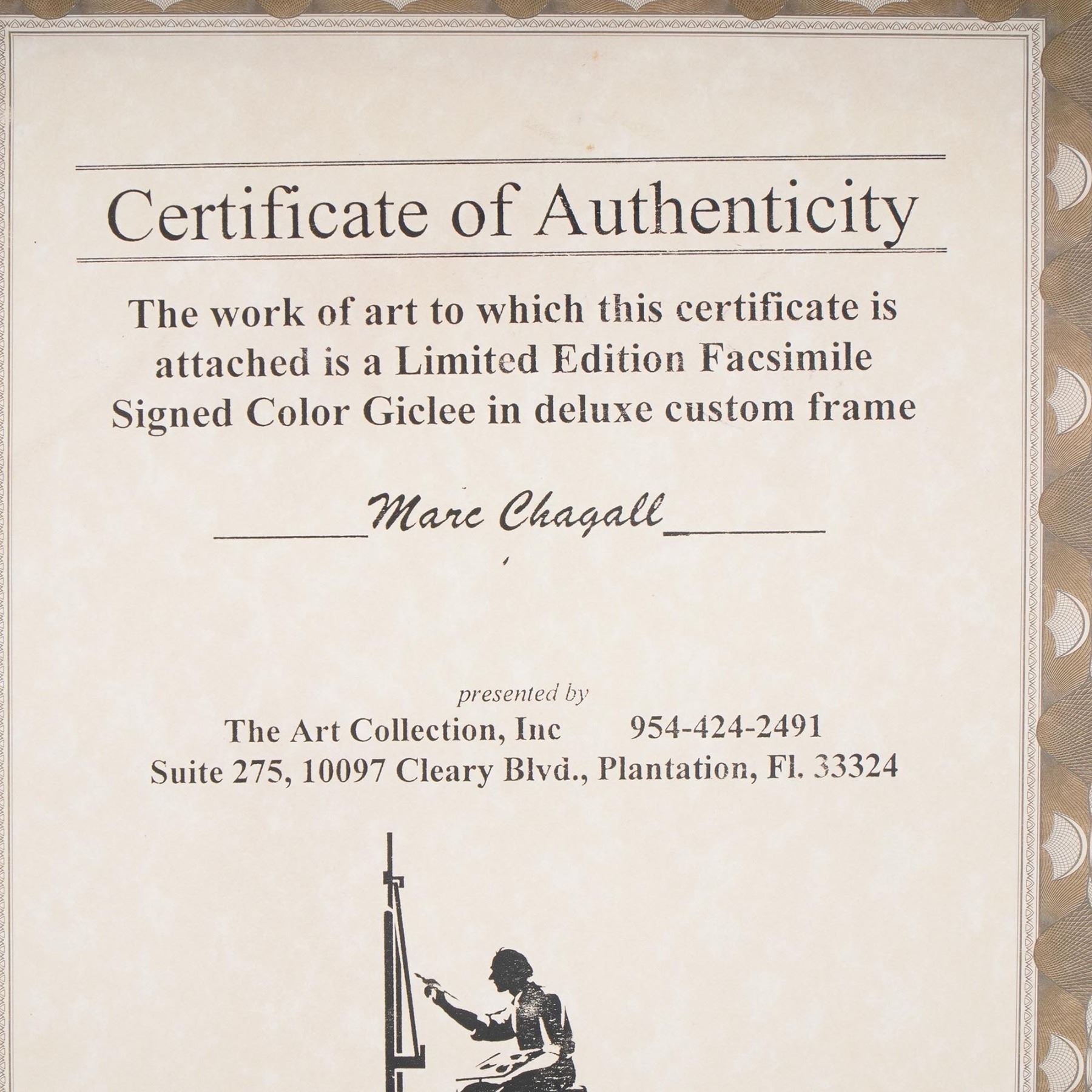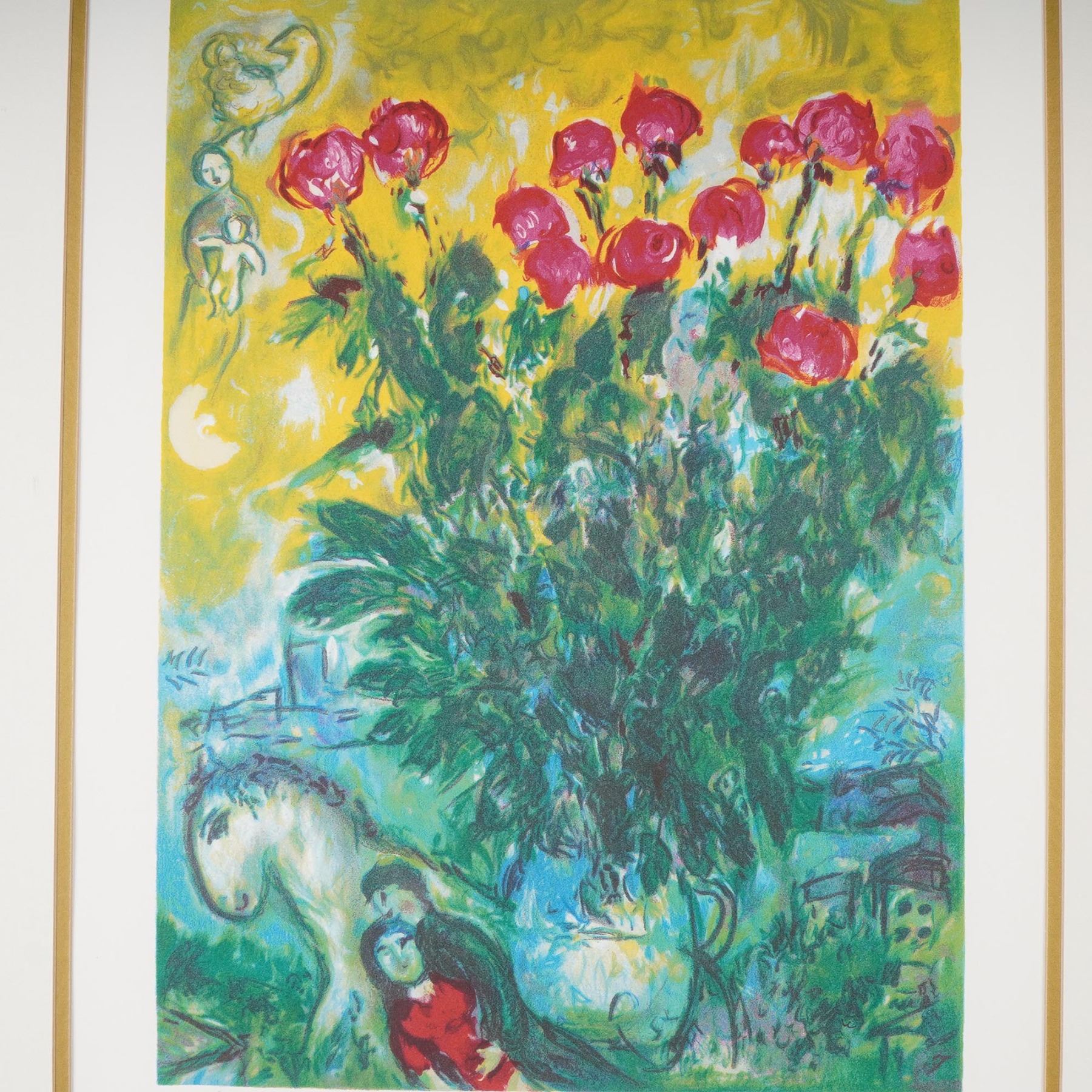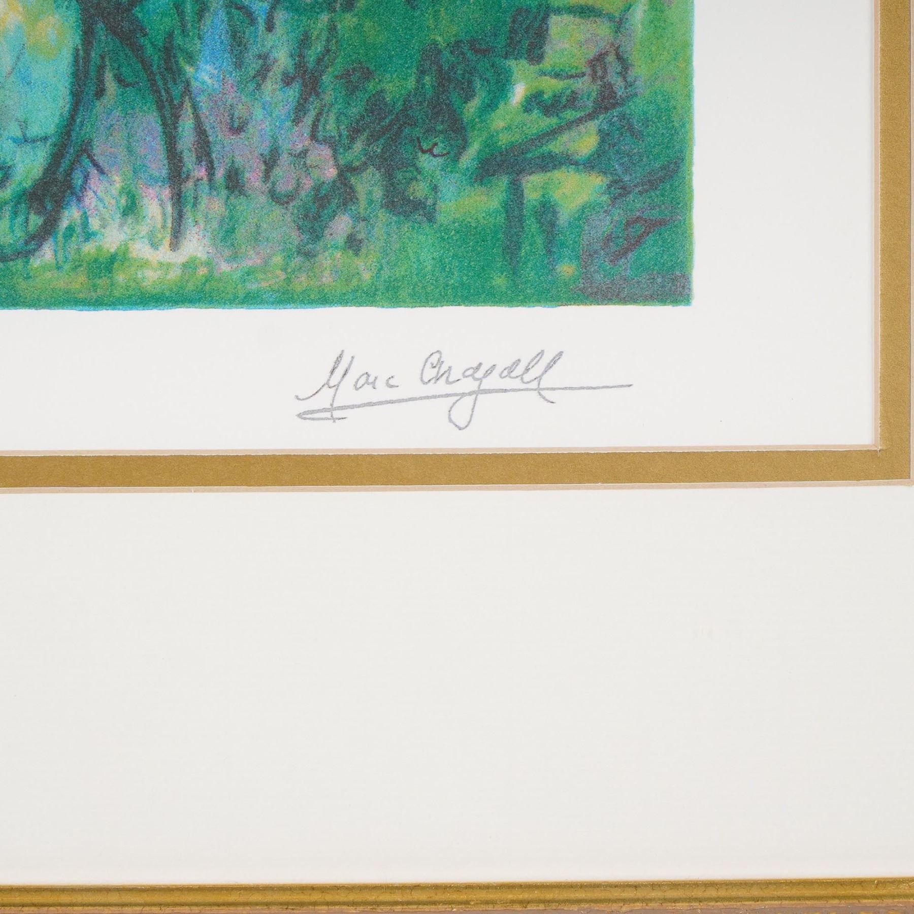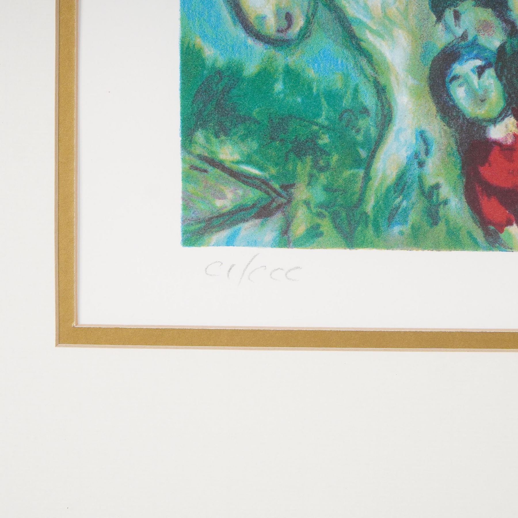 Framed limited edition facsimile giclee print after Marc Chagall, titled and numbered 101/300. This vibrant work features Chagall's iconic dreamlike composition with figures, foliage, and bold floral elements, rendered in rich color. Signed Marc Chagall in the plate and accompanied by a Certificate of Authenticity from The Art Collection, Inc., affirming it is a signed color giclee in a deluxe custom frame. Elegantly presented in a gold-tone frame with double matting. Certificate of Authenticity included.