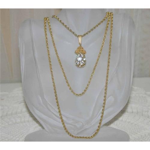 Gorgeous and weighty this vintage Mariam Haskell Necklace has three tiers of fancy rob style gold plated chains, longest chain measuring 31 inches to 24 inches and 16 inches long. The shortest of the three chains is adorned with sparkling Roses Montees formed into a Rhinestone Ball pendant. Rose shaped filigree findings complete this fabulous vintage Mariam Haskell Necklace. Stamped Miriam Haskell on a metal hang-tag with the stamp showing through to the back side, dating this Necklace between the 1970s-80s. The pendant including bale measures 2 inches long with ¾ of an inch diameter. Stunning!
