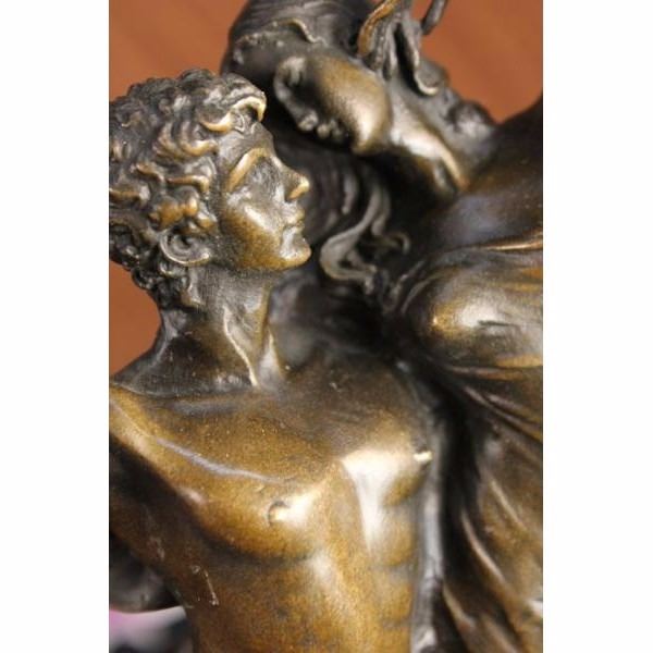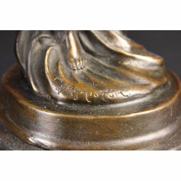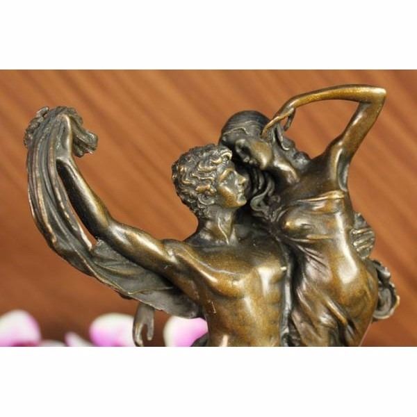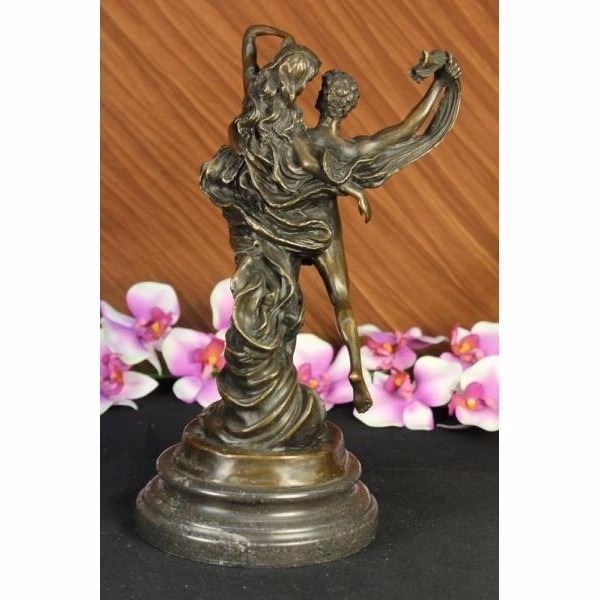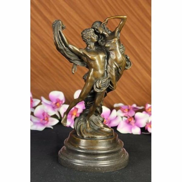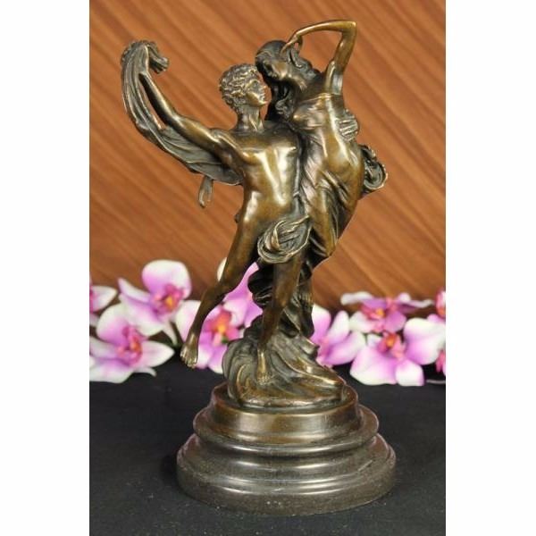 Lost in a moment of serenity and grace this couple forgets the worldsand gets swept up in the winds of love and lets an uncontrollablestorm of emotion take the lead.She wears a long slim fitting dressthat outlines her body he is nude and the whisps of the cloud coverhis privates. They look deeply into each others eyes with a slightsmile as they dance the night away. With great poise and posture theydraw attention from everyone surrounding letting there love be knownand letting the crowd be envious. This sculpture was cast using the"Lost Wax Method" and has a brown patina, it is mounted on a marblebase and is signed Marioton. Condition : This sculpture is in perfect condition. Bronze Dimensions with Marble Base:Height 12" x Width 6" Marble size: Diameter 5 1/2" Height without base: 10" Weight : 9 LBS Inventory : 72Y5134227