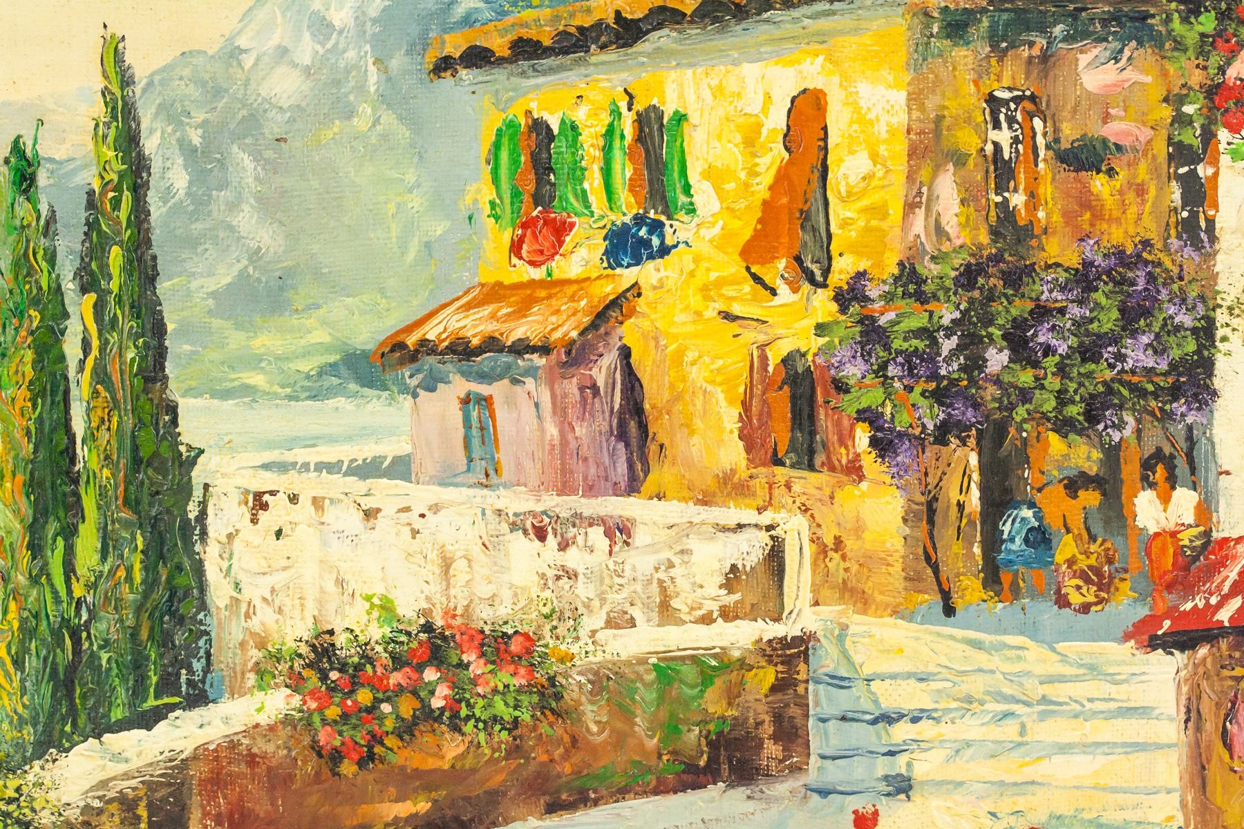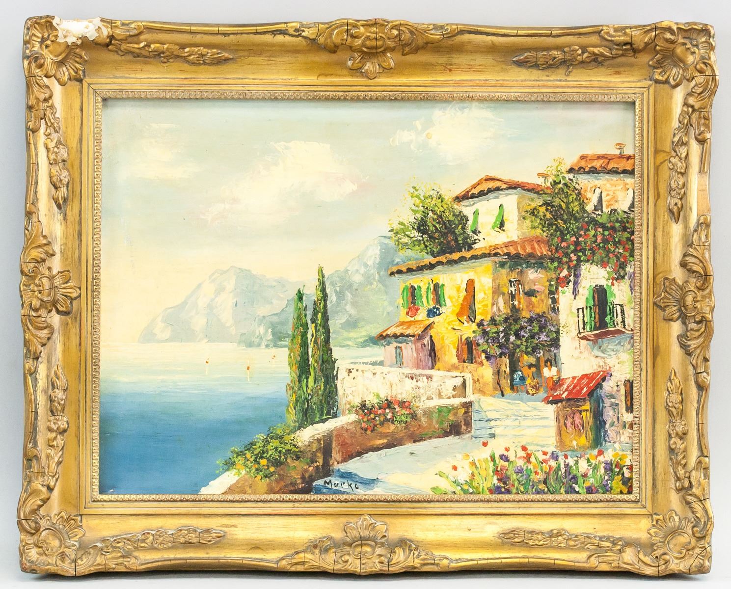 Oil on canvas, framed. Featuring European seaside home. Signed in the center bottom. Stamped with "Made in Austria" on verso. 31 x 41 cm (12 x 16 inch), Frame: 40 x 50 cm (15.75 x 19.5 inch).