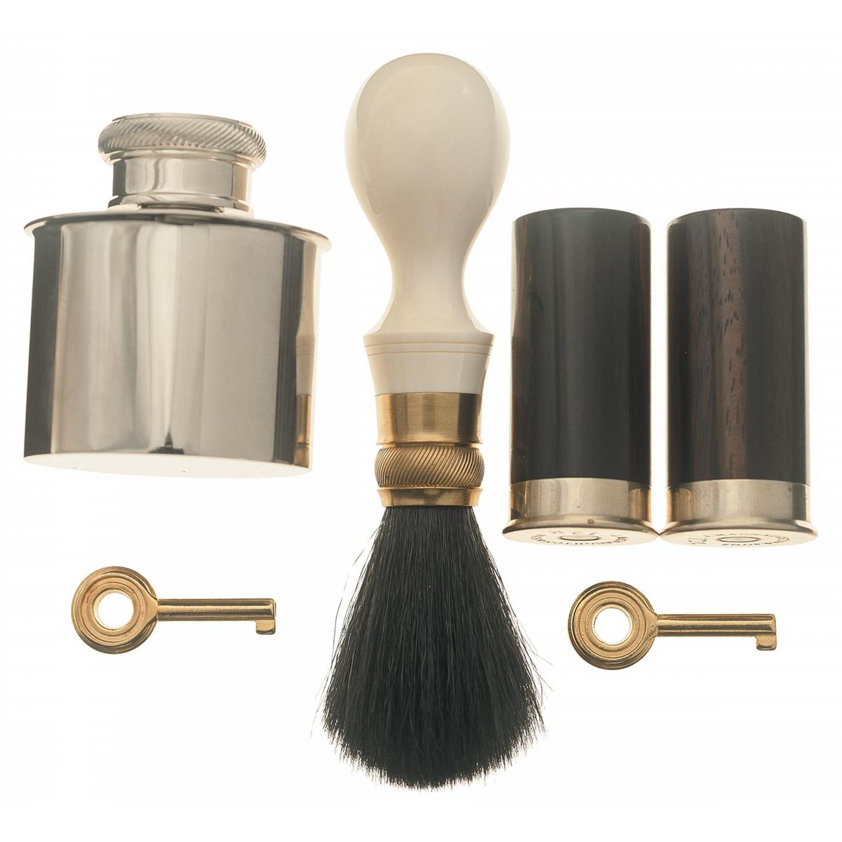 Features a single brass bead on a solid concave matte rib, 2-3/4" chambers, choked improved modified/improved modified with ejectors. The rib is marked "JAMES MACNAUGHTON, 21 FREDERICK STREET, EDINBURGH" followed by "THE EDINBURGH GUN". MacNaughton set up business in 1864 in Edinburgh and won acclaim for the "Lock Fast Breechloader" and "Edinburgh Patent Hammerless Ejector", patented in 1879. 1 3/4 inches of the breech end of the rib are engraved with floral scroll designs. The action, trigger guard, break lever and lower tang are decorated with a vine, leaf and grape motif. Each side of the action is marked "MACNAUGHTON" . Directly to the right of the triggers is signed "B. BARA". The barrels are blue with casehardened remaining parts. Double triggers, tang mounted automatic safety with gold "SAFE" and mounted with a very nicely figured multi-point checkered walnut splinter forearm and straight grip stock with a leather recoil pad and gold initial oval. The bores are .728. The drop at heel is 1-1/2" and drop at comb is 1-1/4". Cast off 1/4" and toe out 7/8". Length of pull is 15". The shotgun comes in a oak and leather Huey takedown case with brass corner protectors and hardware, leather straps and handle. The lining is royal blue and there is a James MacNaughton label affixed to the inside of the lid. In the case is a ivory handled horse hair brush, a nickel MacNaughton oiler and two MacNaughton snap caps.